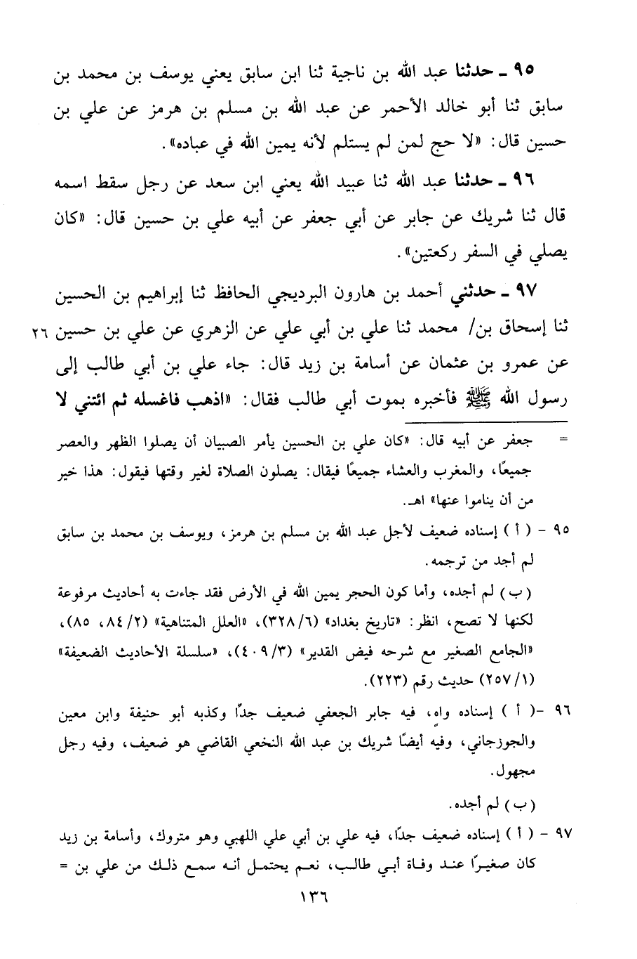 97 - حَدَّثَنِي أَحْمَدُ بْنُ هَارُونَ الْبَرْدِيجِيُّ الْحَافِظُ، ثنا إِبْرَاهِيمُ بْنُ الْحُسَيْنِ، ثنا إِسْحَاقُ بْنُ مُحَمَّدٍ، ثنا عَلِيُّ بْنُ أَبِي عَلِيٍّ، عَنِ الزُهْرِيِّ، عَنْ عَلِيِّ بْنِ حُسَيْنٍ، عَنْ عَمْرِو بْنِ عُثْمَانَ، عَنْ أُسَامَةَ بْنِ زَيْدٍ قَالَ: جَاءَ عَلِيُّ بْنُ أَبِي طَالِبٍ إِلَى رَسُولِ اللَّهِ صَلَّى اللهُ عَلَيْهِ وَسَلَّمَ فَأَخْبَرَهُ بِمَوْتِ أَبِي طَالِبٍ فَقَالَ: «اذْهَبْ فَاغْسِلْهُ ثُمَّ ائْتِنِي لَا -[137]- تُحْدِثْ حَدَثًا حَتَّى تَأْتِيَنِي» فَغَسَّلَهُ وَوَارَاهُ، ثُمَّ أَتَاهُ فَقَالَ: «اذْهَبْ فَاغْتَسِلْ»