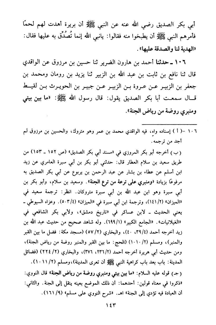 106 - حَدَّثَنَا أَحْمَدُ بْنُ هَارُونَ الضَّرِيرُ، ثنا حُسَيْنُ بْنُ مَرْزُوقٍ، عَنِ الْوَاقِدِيِّ قَالَ: ثنا نَافِعُ بْنُ ثَابِتِ بْنِ عَبْدِ اللَّهِ بْنِ الزُّبَيْرِ، ثنا يَزِيدُ بْنُ رُومَانَ، وَمُحَمَّدُ بْنُ جَعْفَرِ بْنِ الزُّبَيْرِ، عَنْ عُرْوَةَ بْنِ الزُّبَيْرِ، عَنْ جُبَيْرِ بْنِ الْحُوَيْرِثِ بْنِ لَقِيطٍ قَالَ: سَمِعْتُ أَبَا بَكْرٍ الصِّدِّيقَ، يَقُولُ: قَالَ رَسُولُ اللَّهِ صَلَّى اللهُ عَلَيْهِ وَسَلَّمَ: «مَا بَيْنَ بَيْتِي وَمِنْبَرِي رَوْضَةٌ مِنْ رِيَاضِ الْجَنَّةِ»