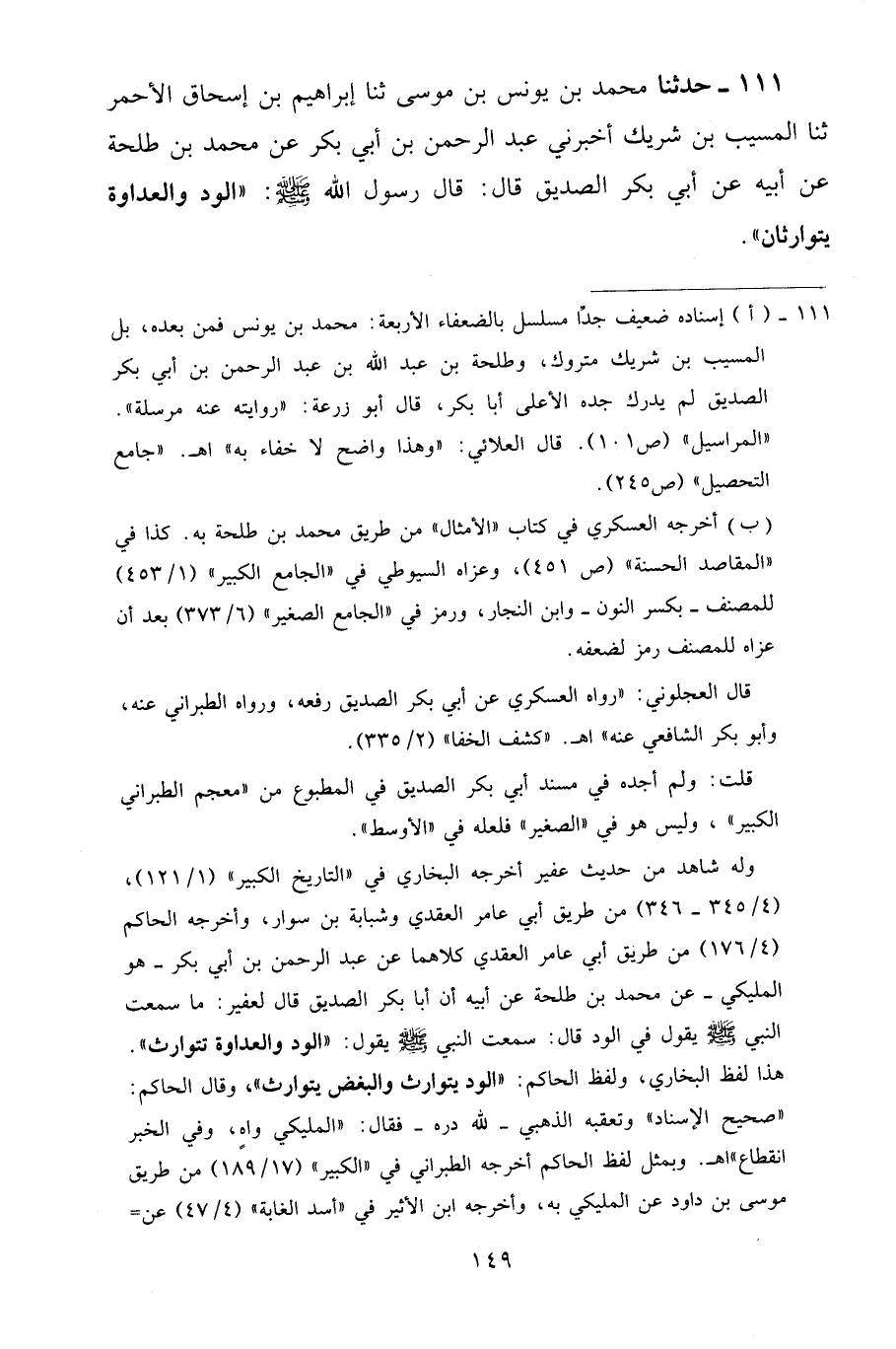 111 - حَدَّثَنَا مُحَمَّدُ بْنُ يُونُسَ بْنِ مُوسَى، ثنا إِبْرَاهِيمُ بْنُ إِسْحَاقَ الْأَحْمَرُ، ثنا الْمُسَيَّبُ بْنُ شَرِيكٍ، أَخْبَرَنِي عَبْدُ الرَّحْمَنِ بْنُ أَبِي بَكْرٍ، عَنْ مُحَمَّدِ بْنِ طَلْحَةَ، عَنْ أَبِيهِ، عَنْ أَبِي بَكْرٍ الصِّدِّيقِ قَالَ: قَالَ رَسُولُ اللَّهِ صَلَّى اللهُ عَلَيْهِ وَسَلَّمَ: «الْوُدُّ وَالْعَدَاوَةُ يَتَوَارَثَانِ»