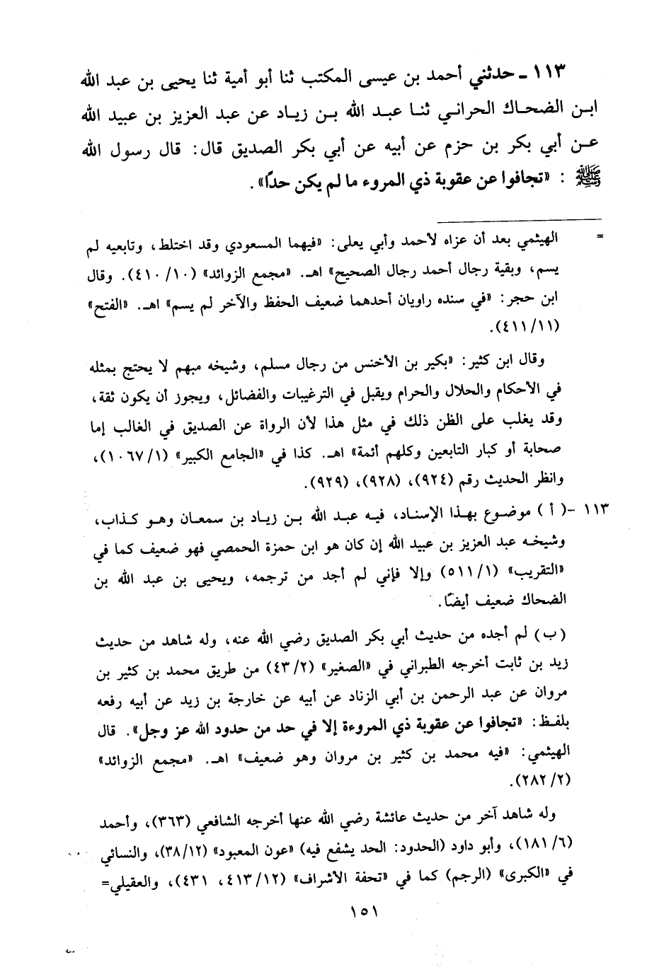 113 - حَدَّثَنِي أَحْمَدُ بْنُ عِيسَى الْمُكْتِبُ، ثنا أَبُو أُمَيَّةَ، ثنا يَحْيَى بْنُ عَبْدِ اللَّهِ بْنِ الضَّحَّاكِ الْحَرَّانِيُّ، ثنا عَبْدُ اللَّهِ بْنُ زِيَادٍ، عَنْ عَبْدِ الْعَزِيزِ بْنِ عُبَيْدِ اللَّهِ، عَنْ أَبِي بَكْرِ بْنِ حَزْمٍ، عَنْ أَبِيهِ، عَنْ أَبِي بَكْرٍ الصِّدِّيقِ قَالَ: قَالَ رَسُولُ اللَّهِ صَلَّى اللهُ عَلَيْهِ وَسَلَّمَ: «تَجَافَوْا عَنْ عُقُوبَةِ ذِي الْمُرُوءَةِ مَا لَمْ يَكُنْ حَدًّا»