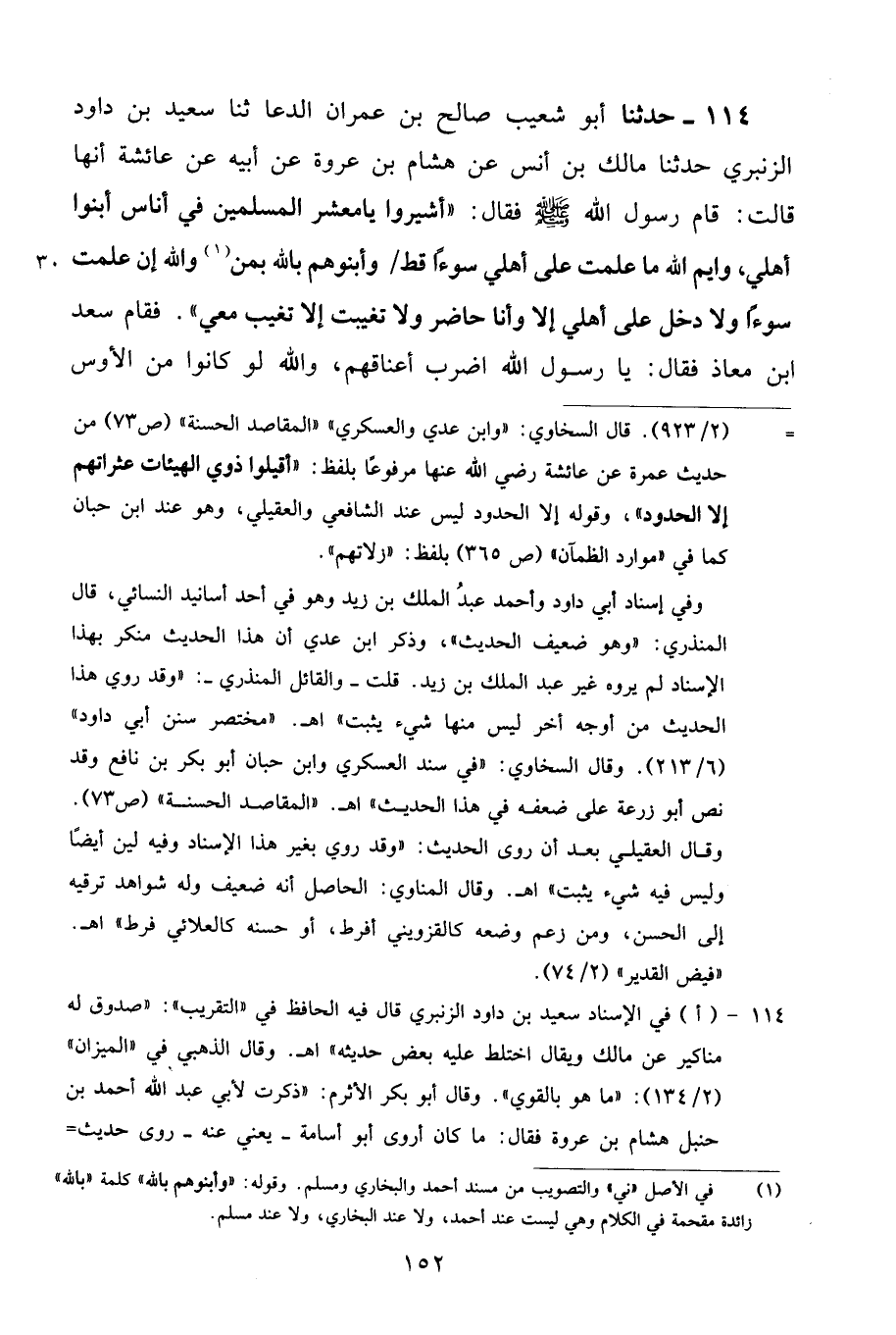 114 - حَدَّثَنَا أَبُو شُعَيْبٍ صَالِحُ بْنُ عِمْرَانَ الدَّعَّاءُ، ثنا سَعِيدُ بْنُ دَاوُدَ الزُّنْبُرِيُّ، حَدَّثَنَا مَالِكُ بْنُ أَنَسٍ، عَنْ هِشَامِ بْنِ عُرْوَةَ، عَنْ أَبِيهِ، عَنْ عَائِشَةَ، أَنَّهَا قَالَتْ: قَامَ رَسُولُ اللَّهِ صَلَّى اللهُ عَلَيْهِ وَسَلَّمَ فَقَالَ: «أَشِيرُوا يَا مَعْشَرَ الْمُسْلِمِينَ فِي أُنَاسٍ أَبَنُوا أَهْلِي، وَايْمُ اللَّهِ مَا عَلِمْتُ عَلَى أَهْلِي سُوءًا قَطُّ، وَأَبَنُوهُمْ بِاللَّهِ بِمَنْ وَاللَّهِ إِنْ عَلِمْتُ سُوءًا وَلَا دَخَلَ عَلَى أَهْلِي إِلَّا وَأَنَا حَاضِرٌ وَلَا تَغَيَّبْتُ إِلَّا تَغَيَّبَ مَعِي». فَقَامَ سَعْدُ بْنُ مُعَاذٍ فَقَالَ: يَا رَسُولَ اللَّهِ اضْرِبْ أَعْنَاقَهُمْ، وَاللَّهِ لَوْ كَانُوا مِنَ الْأَوْسِ -[153]- لَرَأَيْتُ أَنْ أَضْرِبَ أَعْنَاقَهُمْ، فَقَامَ سَعْدُ بْنُ عُبَادَةَ مِنَ الْخَزْرَجِ وَكَانَتْ أُمُّ حَسَّانَ مِنَ الْخَزْرَجِ وَكَانَتْ بِنْتَ عَمِّهِ مِنْ فَخِذِهِ، فَقَالَ: وَاللَّهِ مَا صَدَقْتَ وَلَوْ كَانُوا مِنْ رَهْطِكَ مَا رَضِيتَ أَنْ يُقَتَّلُوا فَتَنَازَعَ سَعْدُ بْنُ مُعَاذٍ، وَسَعْدُ بْنُ عُبَادَةَ، فَكَادَ أَنْ يَكُونَ بَيْنَ الْأَوْسِ وَالْخَزْرَجِ فِي الْمَسْجِدِ شَرٌّ وَمَا عَلِمَتْ عَائِشَةُ فِي ذَلِكَ بِشَيْءٍ مِمَّا قِيلَ وَلَا بَلَغَهَا مِنْ حَدِيثِهِمْ شَيْءٌ حَتَّى إِذَا كَانَ مَسَاءُ يَوْمٍ قَامَ فِيهِ رَسُولُ اللَّهِ صَلَّى اللهُ عَلَيْهِ وَسَلَّمَ أَخْبَرَتْهَا أُمُّ مِسْطَحٍ فَأَخْبَرَتْهَا عَنْ مِسْطَحٍ، وَذَكَرَهُ لَهَا رَسُولُ اللَّهِ صَلَّى اللهُ عَلَيْهِ وَسَلَّمَ الْغَدَ بَعْدَ مَا صَلَّى الظُّهْرَ، فَلَمَّا ذَكَرَهُ لَهَا رَسُولُ اللَّهِ صَلَّى اللهُ عَلَيْهِ وَسَلَّمَ وَعِنْدَهَا أَبُوهَا وَأُمُّهَا أَنْزَلَ اللَّهُ بَرَاءَتَهَا فِي مَجْلِسِهِ ذَلِكَ الَّذِي ذَكَرَهُ لَهَا رَسُولُ اللَّهِ صَلَّى اللهُ عَلَيْهِ وَسَلَّمَ قَبْلَ أَنْ يَتَفَرَّقُوا، وَقَبْلَ أَنْ يَقُومُوا مِنْ عِنْدِهَا أَبُوهَا وَأُمُّهَا رَضِيَ اللَّهُ عَنْهُمْ