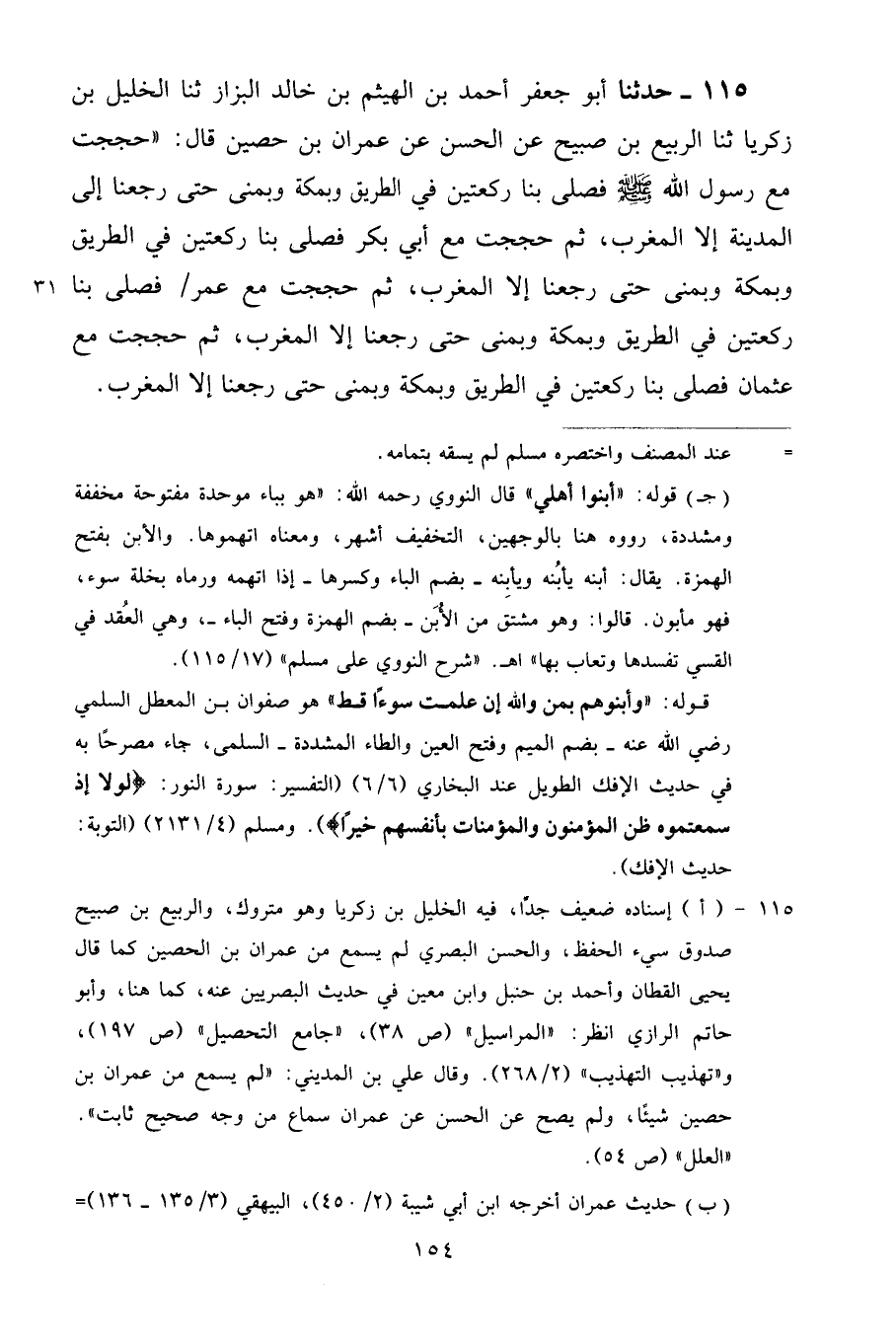 115 - حَدَّثَنَا أَبُو جَعْفَرٍ أَحْمَدُ بْنُ الْهَيْثَمِ بْنِ خَالِدٍ الْبَزَّازُ، ثنا الْخَلِيلُ بْنُ زَكَرِيَّا، ثنا الرَّبِيعُ بْنُ صُبَيْحٍ، عَنِ الْحَسَنِ، عَنْ عِمْرَانَ بْنِ حُصَيْنٍ قَالَ: «حَجَجْتُ مَعَ رَسُولِ اللَّهِ صَلَّى اللهُ عَلَيْهِ وَسَلَّمَ فَصَلِّي بِنَا رَكْعَتَيْنِ فِي الطَّرِيقِ وَبِمَكَّةَ وَبِمِنًى حَتَّى رَجَعْنَا إِلَى الْمَدِينَةِ إِلَّا الْمَغْرِبَ، ثُمَّ حَجَجْتُ مَعَ أَبِي بَكْرٍ فَصَلِّي بِنَا رَكْعَتَيْنِ فِي الطَّرِيقِ وَبِمَكَّةَ وَبِمِنًى حَتَّى رَجَعْنَا إِلَّا الْمَغْرِبَ، ثُمَّ حَجَجْتُ مَعَ عُمَرَ فَصَلَّى بِنَا رَكْعَتَيْنِ فِي الطَّرِيقِ وَبِمَكَّةَ وَبِمِنًى حَتَّى رَجَعْنَا إِلَّا الْمَغْرِبَ، ثُمَّ حَجَجْتُ مَعَ عُثْمَانَ فَصَلَّى بِنَا رَكْعَتَيْنِ فِي الطَّرِيقِ وَبِمَكَّةَ وَبِمِنًى حَتَّى رَجَعْنَا إِلَّا الْمَغْرِبَ»