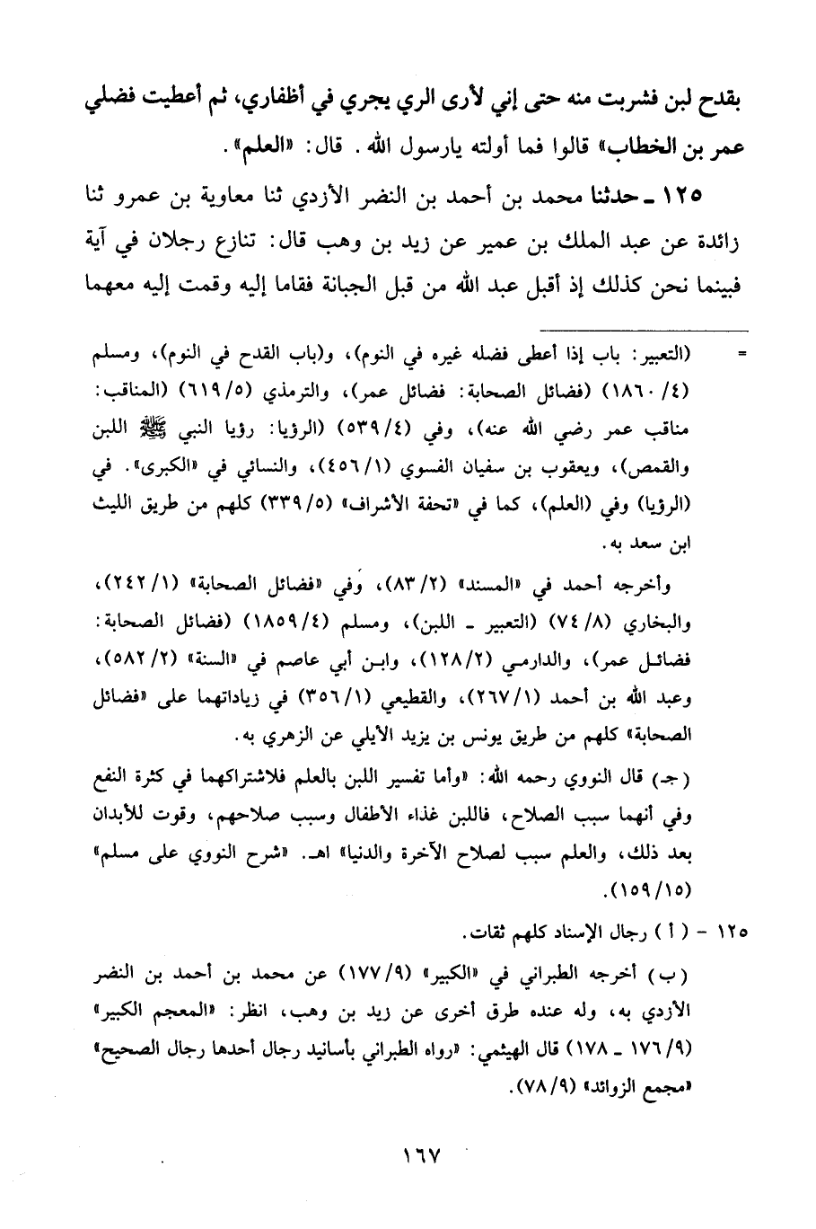 125 - حَدَّثَنَا مُحَمَّدُ بْنُ أَحْمَدَ بْنِ النَّضْرِ الْأَزْدِيُّ، ثنا مُعَاوِيَةُ بْنُ عَمْرٍو، ثنا زَائِدَةُ، عَنْ عَبْدِ الْمَلِكِ بْنِ عُمَيْرٍ، عَنْ زَيْدِ بْنِ وَهْبٍ قَالَ: تَنَازَعَ رَجُلَانِ فِي آيَةٍ فَبَيْنَمَا نَحْنُ كَذَلِكَ إِذْ أَقْبَلَ عَبْدُ اللَّهِ مِنْ قِبَلِ الْجَبَّانَةِ فَقَامَا إِلَيْهِ وَقُمْتُ إِلَيْهِ مَعَهُمَا -[168]- فَقَالَا: إِنَّا تَنَازَعْنَا فِي آيَةٍ فَقَالَ عَبْدُ اللَّهِ لِأَحَدِهِمَا: أَقِرَّهُ فَقَرَأَ فَقَالَ: مَنْ أَقْرَأَكَهَا؟ فَقَالَ أَبُو عَمْرَةَ مَعْقِلُ بْنُ مُقَرِّنٍ، ثُمَّ قَالَ لِلْآخَرِ: أَقِرَّهُ فَقَرَأَ فَقَالَ: مَنْ أَقْرَأَكَهَا؟ فَقَالَ: عُمَرُ، فَجَاءَتَا عَيْنَاهُ بِأَرْبَعَةٍ فَبَكَى حَتَّى رَأَيْتُهُ أَخَذَ دُمُوعَهُ بِكَفِّهِ فَقَالَ بِهِ هَكَذَا، فَرَأَيْتُ أَثَرَيْنَ فِي الْحَصَا مِنْ دُمُوعِ عَبْدِ اللَّهِ، ثُمَّ قَالَ عَبْدُ اللَّهِ: مَا أَظُنُّ أَهْلَ بَيْتٍ مِنَ الْمُسْلِمِينَ لَمْ يَدْخُلْ عَلَيْهِمْ حُزْنُ عُمَرَ يَوْمَ أُصِيبَ إِلَّا أَهْلَ بَيْتِ سُوءٍ، إِنَّ عُمَرَ كَانَ أَعْلَمَنَا بِاللَّهِ وَأَقْرَأَنَا لِكِتَابِ اللَّهِ وَأَفْقَهَنَا فِي دِينِ اللَّهِ، اقْرَأْ كَمَا أَقْرَأَكَهَا عُمَرُ فَوَاللَّهِ لَهِيَ أَبْيَنُ مِنْ طَرِيقِ السَّيْلَحَيْنِ
