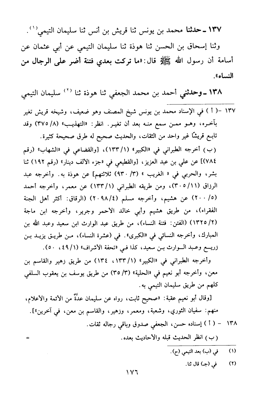 137 - حَدَّثَنَا مُحَمَّدُ بْنُ يُونُسَ، ثنا قُرَيْشُ بْنُ أَنَسٍ، ثنا سُلَيْمَانُ التَّيْمِيُّ، وثنا إِسْحَاقُ بْنُ الْحَسَنِ، ثنا هَوْذَةُ، ثنا سُلَيْمَانُ التَّيْمِيُّ، عَنْ أَبِي عُثْمَانَ، عَنْ أُسَامَةَ أَنَّ رَسُولَ اللَّهِ صَلَّى اللهُ عَلَيْهِ وَسَلَّمَ قَالَ: «مَا تَرَكْتُ بَعْدِي فِتْنَةً أَضَرَّ عَلَى الرِّجَالِ مِنَ النِّسَاءِ»