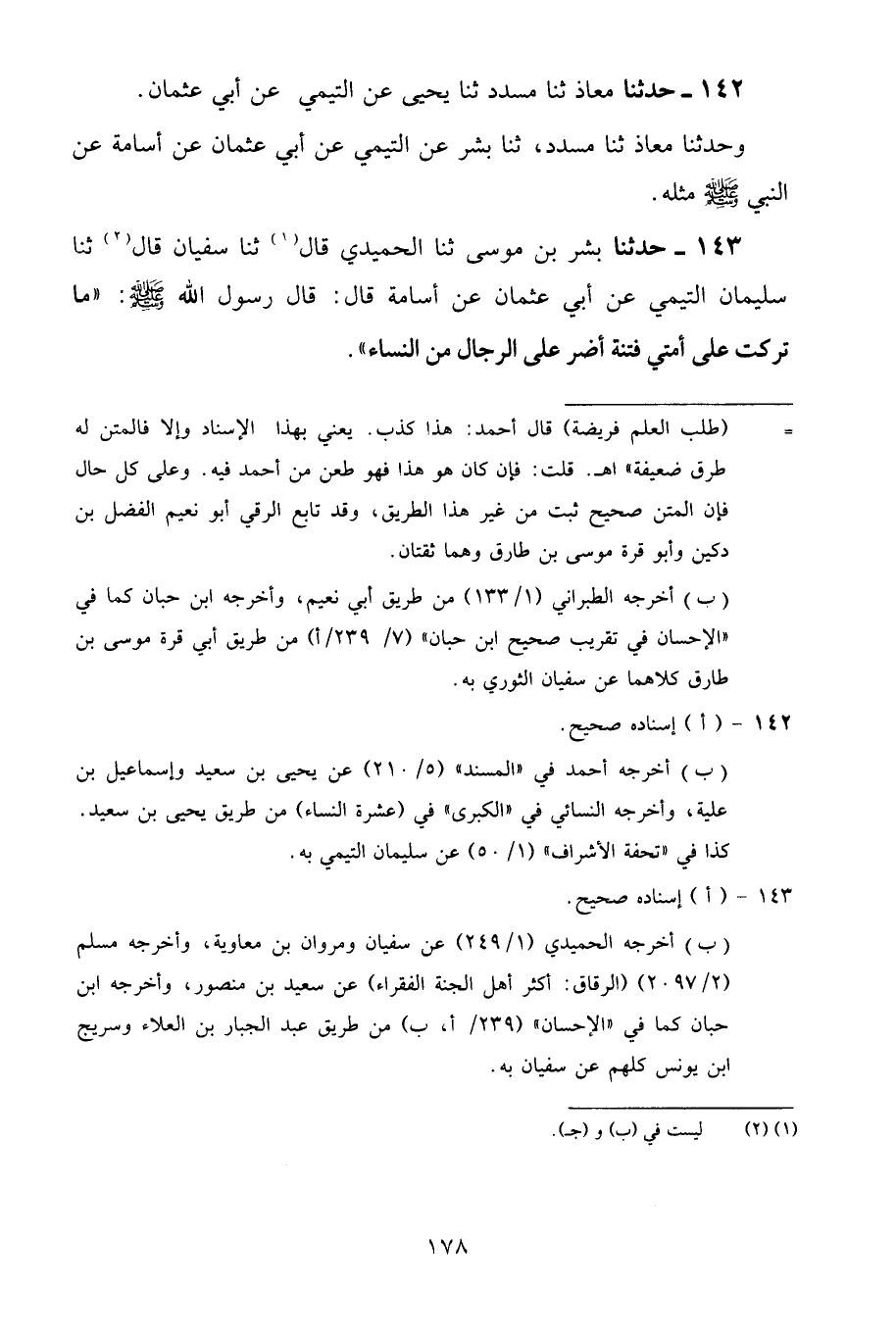 143 - حَدَّثَنَا بِشْرُ بْنُ مُوسَى، ثنا الْحُمَيْدِيُّ قَالَ: ثنا سُفْيَانُ قَالَ: ثنا سُلَيْمَانُ التَّيْمِيُّ، عَنْ أَبِي عُثْمَانَ، عَنْ أُسَامَةَ قَالَ: قَالَ رَسُولُ اللَّهِ صَلَّى اللهُ عَلَيْهِ وَسَلَّمَ: «مَا تَرَكْتُ عَلَى أُمَّتِي فِتْنَةً أَضَرَّ عَلَى الرِّجَالِ مِنَ النِّسَاءِ»