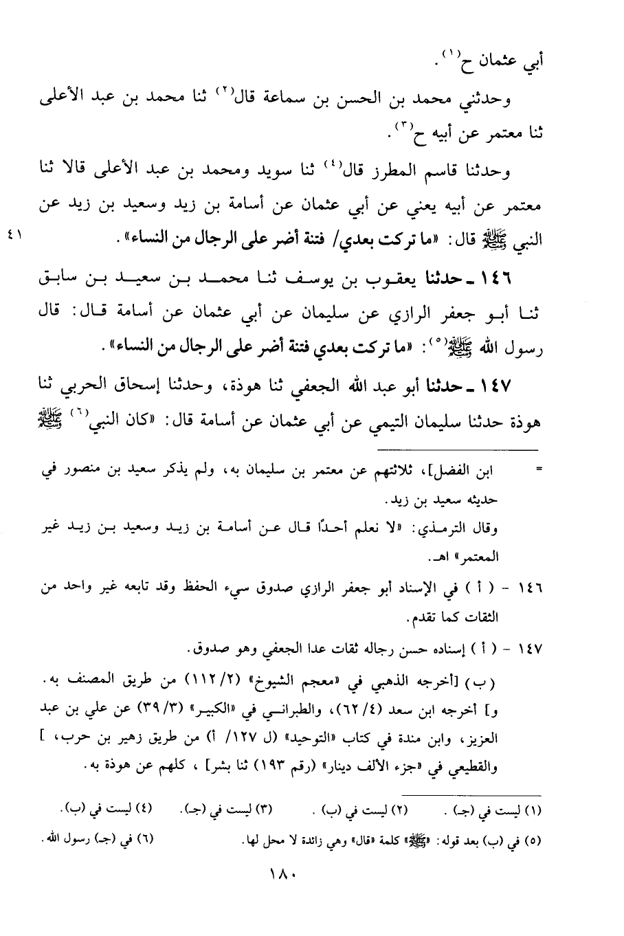 146 - حَدَّثَنَا يَعْقُوبُ بْنُ يُوسُفَ، ثنا مُحَمَّدُ بْنُ سَعِيدِ بْنِ سَابِقٍ، ثنا أَبُو جَعْفَرٍ الرَّازِيُّ، عَنْ سُلَيْمَانَ، عَنْ أَبِي عُثْمَانَ، عَنْ أُسَامَةَ قَالَ: قَالَ رَسُولُ اللَّهِ صَلَّى اللهُ عَلَيْهِ وَسَلَّمَ: «مَا تَرَكْتُ بَعْدِي فِتْنَةً أَضَرَّ عَلَى الرِّجَالِ مِنَ النِّسَاءِ»