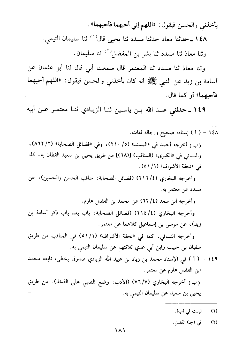 149 - حَدَّثَنِي عَبْدُ اللَّهِ بْنُ يَاسِينَ، ثنا الزِّيَادِيُّ، ثنا مُعْتَمِرٍ، عَنْ أَبِيهِ -[182]-، عَنْ أَبِي عُثْمَانَ، عَنْ أُسَامَةَ أَنَّ النَّبِيَّ صَلَّى اللهُ عَلَيْهِ وَسَلَّمَ كَانَ يُقْعِدُهُ عَلَى فَخِذِهِ وَيُقْعِدُ الْحَسَنَ عَلَى الْفَخِذِ الْآخَرِ، ثُمَّ يَضُمُّهُمَا وَيَقُولُ: «اللَّهُمَّ ارْحَمْهُمَا فَإِنِّي أَرْحَمُهُمَا»