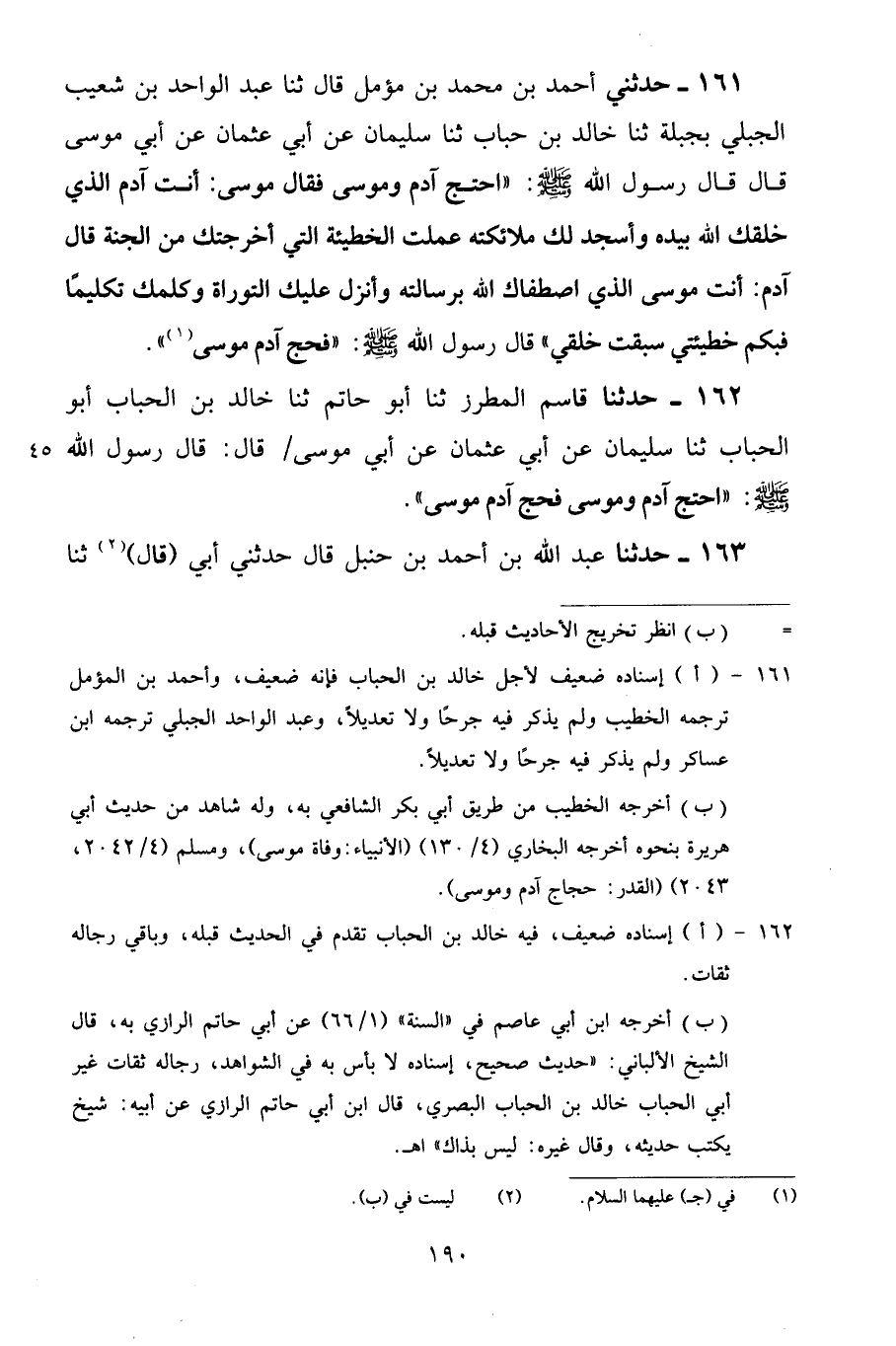 161 - حَدَّثَنِي أَحْمَدُ بْنُ مُحَمَّدِ بْنِ مُؤَمَّلٍ قَالَ: ثنا عَبْدُ الْوَاحِدِ بْنُ شُعَيْبٍ الْجَبَلِيُّ بِجَبَلَةَ، ثنا خَالِدُ بْنُ حُبَابٍ، ثنا سُلَيْمَانُ، عَنْ أَبِي عُثْمَانَ، عَنْ أَبِي مُوسَى قَالَ: قَالَ رَسُولُ اللَّهِ صَلَّى اللهُ عَلَيْهِ وَسَلَّمَ: " احْتَجَّ آدَمُ وَمُوسَى فَقَالَ مُوسَى: أَنْتَ آدَمُ الَّذِي خَلَقَكَ اللَّهُ بِيَدِهِ وَأَسْجَدَ لَكَ مَلَائِكَتَهُ عَمِلْتَ الْخَطِيئَةَ الَّتِي أَخْرَجَتْكَ مِنَ الْجَنَّةِ قَالَ آدَمُ أَنْتَ مُوسَى الَّذِي اصْطَفَاكَ اللَّهُ بِرِسَالَتِهِ وَأَنْزَلَ عَلَيْكَ التَّوْرَاةَ وَكَلَّمَكَ تَكْلِيمًا فَبِكَمْ خَطِيئَتِي سَبَقَتْ خَلْقِي " قَالَ رَسُولُ اللَّهِ صَلَّى اللهُ عَلَيْهِ وَسَلَّمَ: «فَحَجَّ آدَمُ مُوسَى»
