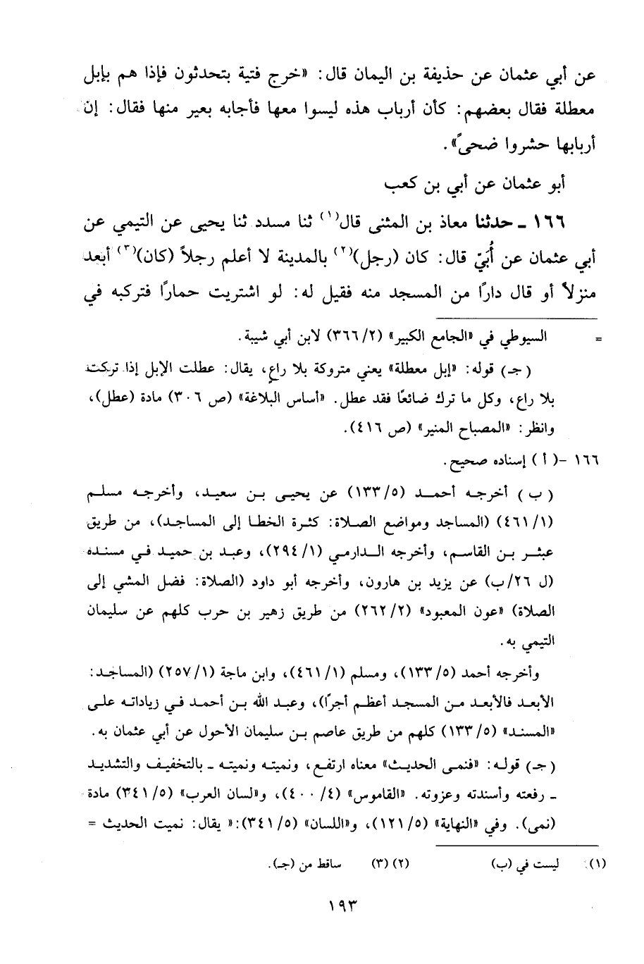 166 - حَدَّثَنَا مُعَاذُ بْنُ الْمُثَنَّى قَالَ: ثنا مُسَدَّدٌ، ثنا يَحْيَى، عَنِ التَّيْمِيِّ، عَنْ أَبِي عُثْمَانَ، عَنْ أُبَيٍّ قَالَ: كَانَ رَجُلٌ بِالْمَدِينَةِ لَا أَعْلَمُ رَجُلًا كَانَ أَبْعَدَ مَنْزِلًا أَوْ قَالَ دَارًا مِنَ الْمَسْجِدِ مِنْهُ، فَقِيلَ لَهُ: لَوِ اشْتَرَيْتَ حِمَارًا فَتَرْكَبُهُ فِي -[194]- الرَّمْضَاءِ وَالظَّلْمَاءِ فَقَالَ: مَا يَسُرُّنِي أَنَّ دَارِي أَوْ قَالَ مَنْزِلِي إِلَى جَنْبِ الْمَسْجِدِ، فَنَمَى الْحَدِيثُ إِلَى رَسُولِ اللَّهِ صَلَّى اللهُ عَلَيْهِ وَسَلَّمَ فَقَالَ: " مَا أَرَدْتَ بِقَوْلِكَ: مَا يَسُرُّنِي أَنَّ دَارِي أَوْ مَنْزِلِي إِلَى جَنْبِ الْمَسْجِدِ؟ " قَالَ: أَرَدْتُ أَنْ يُكْتَبَ إِقْبَالِي إِذَا أَقْبَلْتُ إِلَى الْمَسْجِدِ وَرُجُوعِي إِذَا رَجَعْتُ إِلَى أَهْلِي قَالَ: «أَنْطَاكَ اللَّهُ ذَلِكَ كُلَّهُ أَنْطَاكَ اللَّهُ مَا احْتَسَبْتَ أَجْمَعَ مَرَّتَيْنِ»
