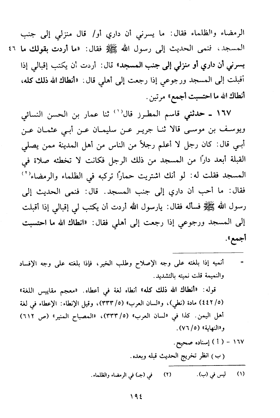 167 - حَدَّثَنِي قَاسِمٌ الْمُطَرِّزُ قَالَ: ثنا عَمَّارُ بْنُ الْحَسَنِ النَّسَائِيُّ، وَيُوسُفُ بْنُ مُوسَى، قَالَا: ثنا جَرِيرٌ، عَنْ سُلَيْمَانَ، عَنْ أَبِي عُثْمَانَ، عَنْ أُبَيٍّ قَالَ: كَانَ رَجُلٌ لَا أَعْلَمُ رَجُلًا مِنَ النَّاسِ مِنْ أَهْلِ الْمَدِينَةِ مِمَّنْ يُصَلِّي الْقِبْلَةَ أَبْعَدَ دَارًا مِنَ الْمَسْجِدِ مِنْ ذَلِكَ الرَّجُلِ فَكَانَتْ لَا تُخْطِئُهُ صَلَاةٌ فِي الْمَسْجِدِ فَقُلْتُ لَهُ: لَوْ أَنَّكَ اشْتَرَيْتَ حِمَارًا تَرْكَبُهُ فِي الظَّلْمَاءِ وَالرَّمْضَاءِ فَقَالَ: مَا أُحِبُّ أَنَّ دَارِي إِلَى جَنْبِ الْمَسْجِدِ قَالَ: فَنَمَى الْحَدِيثُ إِلَى رَسُولِ اللَّهِ صَلَّى اللهُ عَلَيْهِ وَسَلَّمَ فَسَأَلَهُ فَقَالَ: يَا رَسُولَ اللَّهِ أَرَدْتُ أَنْ يُكْتَبَ لِي إِقْبَالِي إِذَا أَقْبَلْتُ إِلَى الْمَسْجِدِ وَرُجُوعِي إِذَا رَجَعْتُ إِلَى أَهْلِي فَقَالَ: «أَنْطَاكَ اللَّهُ مَا احْتَسَبْتَ أَجْمَعَ»
