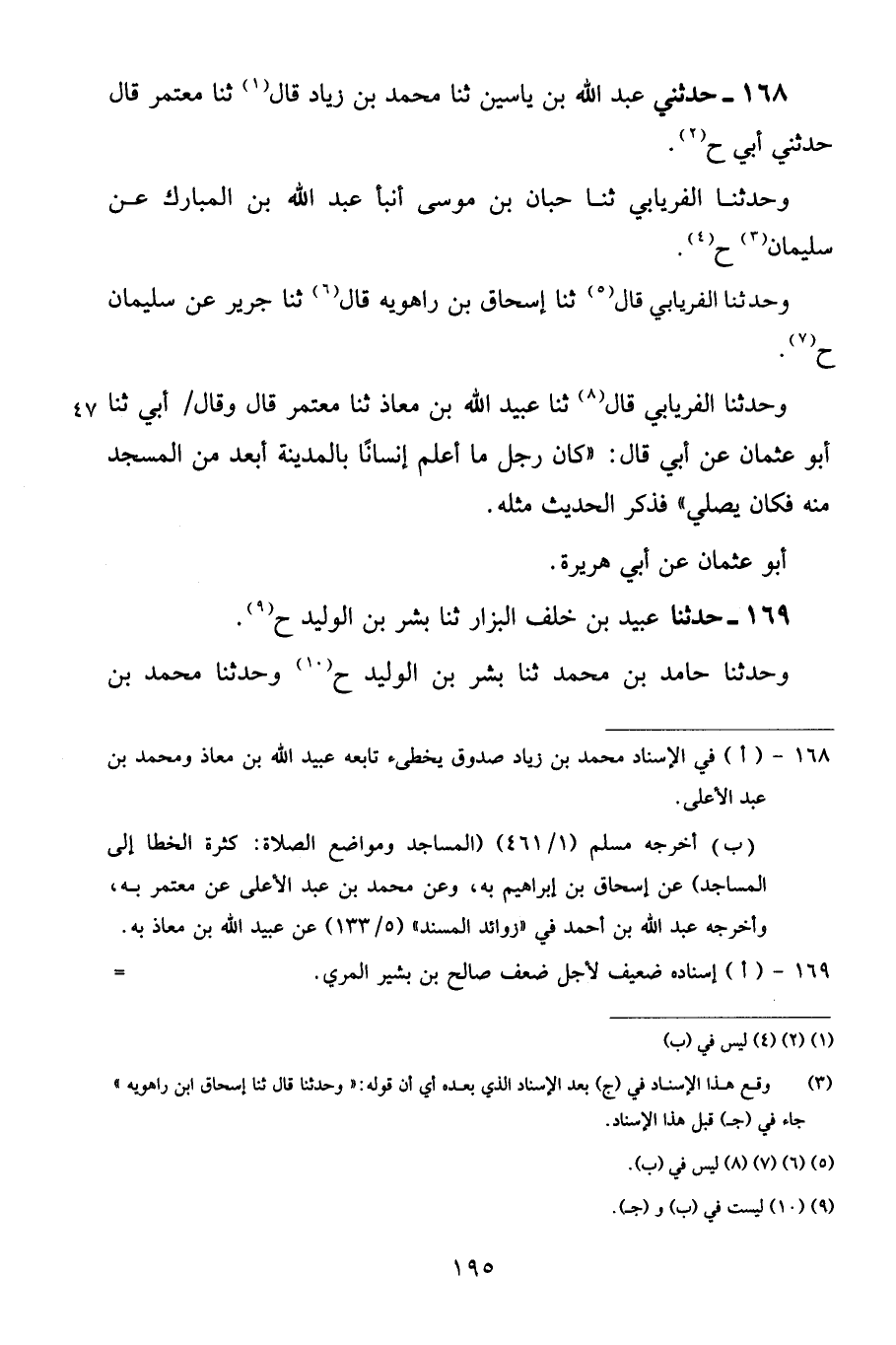 169 - حَدَّثَنَا عُبَيْدُ بْنُ خَلَفٍ الْبَزَّارُ، ثنا بِشْرُ بْنُ الْوَلِيدِ، ح وَحَدَّثَنَا حَامِدُ بْنُ مُحَمَّدٍ، ثنا بِشْرُ بْنُ الْوَلِيدِ، ح، وَحَدَّثَنَا مُحَمَّدُ بْنُ -[196]- يَحْيَى الْمَرْوَزِيُّ، ثنا بِشْرُ بْنُ الْوَلِيدِ الْكِنْدِيُّ، وَلِلْمَرْوَزِيِّ، لَفْظُ الْحَدِيثِ، عَنْ بِشْرٍ قَالَ: ثنا صَالِحٌ الْمُرِّيُّ عَنْ سُلَيْمَانَ التَّيْمِيِّ عَنْ أَبِي عُثْمَانَ النَّهْدِيِّ عَنْ أَبِي هُرَيْرَةَ أَنَّ رَسُولَ اللَّهِ صَلَّى اللهُ عَلَيْهِ وَسَلَّمَ وَقَفَ عَلَى حَمْزَةَ وَقَدْ مُثِّلَ بِهِ فَقَالَ: «رَحْمَةُ اللَّهِ عَلَيْكَ فَإِنَّكَ كُنْتَ مَا عَلِمْتُ فَعُولًا لِلْخَيْرَاتِ وَصُولًا لِلرَّحِمِ، وَلَوْلَا حَرَقٌ» وَقَالَ حَامِدٌ: «حُزْنُ مَنْ بَعْدُ عَلَيْكَ لَسَرَّنِي أَنْ أَدَعَكَ تُحْشَرُ مِنْ أَفْوَاجٍ شَتَّى أَمَا وَاللَّهِ مَعَ ذَاكَ لَأُمَثِّلَنَّ بِسَبْعِينَ مِنْهُمْ مَكَانَكَ» فَنَزَلَ جِبْرِيلُ وَالنَّبِيُّ صَلَّى اللهُ عَلَيْهِ وَسَلَّمَ وَاقِفٌ بَعْدُ بِخَوَاتِيمِ سُورَةِ النَّحْلِ فَقَالَ: {وَإِنْ عَاقَبْتُمْ فَعَاقِبُوا بِمِثْلِ مَا عُوقِبْتُمْ بِهِ وَلَئِنْ صَبَرْتُمْ لَهُوَ خَيْرٌ لِلصَّابِرِينَ} [النحل: 126] إِلَى آخِرِ السُّورَةِ فَصَبَرَ رَسُولُ اللَّهِ صَلَّى اللهُ عَلَيْهِ وَسَلَّمَ وَكَفَّرَ عَنْ يَمِينِهِ وَأَمْسَكَ عَمَّا أَرَادَ