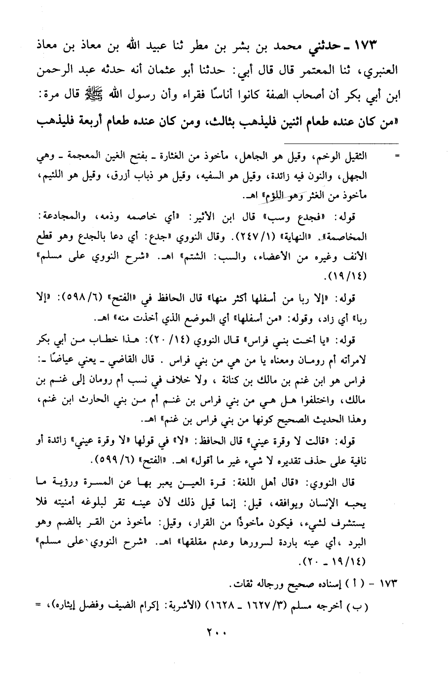 173 - حَدَّثَنِي مُحَمَّدُ بْنُ بِشْرِ بْنِ مَطَرٍ، ثنا عُبَيْدُ اللَّهِ بْنُ مُعَاذِ بْنِ مُعَاذٍ الْعَنْبَرِيُّ، ثنا الْمُعْتَمِرُ قَالَ: قَالَ أَبِي: حَدَّثَنَا أَبُو عُثْمَانَ أَنَّهُ حَدَّثَهُ عَبْدُ الرَّحْمَنِ بْنُ أَبِي بَكْرٍ أَنَّ أَصْحَابَ الصُّفَّةِ كَانُوا أُنَاسًا فُقَرَاءَ، وَأَنَّ رَسُولَ اللَّهِ صَلَّى اللهُ عَلَيْهِ وَسَلَّمَ قَالَ مَرَّةً: «مَنْ كَانَ عِنْدَهُ طَعَامُ اثْنَيْنِ فَلْيَذْهَبْ بِثَالِثٍ، وَمَنْ كَانَ عِنْدَهُ طَعَامُ أَرْبَعَةٍ فَلْيَذْهَبْ -[201]- بِخَامِسٍ بِسَادِسٍ» أَوْ كَمَا قَالَ، وَأَنَّ أَبَا بَكْرٍ جَاءَ بِثَلَاثَةٍ، وَانْطَلَقَ نَبِيُّ اللهِ بِعَشَرَةٍ، وَأَبُو بَكْرٍ بِثَلَاثَةٍ قَالَ: فَهُوَ أَنَا وَأَبِي وَأُمِّي، وَلَا أَدْرِي هَلْ قَالَ: وَامْرَأَتِي وَخَادِمٌ بَيْنَ بَيْتِنَا وَبَيْتِ أَبِي بَكْرٍ، وَأَنَّ أَبَا بَكْرٍ تَعَشَّى عِنْدَ النَّبِيِّ صَلَّى اللهُ عَلَيْهِ وَسَلَّمَ ثُمَّ لَبِثَ حَتَّى صُلِّيَتِ الْعِشَاءُ، ثُمَّ رَجَعَ فَلَبِثَ حَتَّى نَعَسَ رَسُولُ اللَّهِ صَلَّى اللهُ عَلَيْهِ وَسَلَّمَ، فَجَاءَ بَعْدَمَا مَضَى مِنَ اللَّيْلِ مَا شَاءَ اللَّهُ، قَالَتْ لَهُ امْرَأَتُهُ: مَا حَبَسَكَ عَنْ أَضْيَافِكَ أَوْ قَالَتْ: ضَيْفِكَ قَالَ: وَمَا عَشَّيْتِهِمْ؟ قَالَتْ: أَبَوْا حَتَّى تَجِيءَ، قَدْ عُرِضُوا عَلَيْهِمْ فَغَلَبُوهُمْ قَالَ: فَذَهَبْتُ أَنَا فَاخْتَبَأْتُ قَالَ: تَعَالَ يَا غُنْثَرُ، فَجَدَّعَ وَسَبَّ وَقَالَ: كُلُوا لَا هَنِيئًا وَقَالَ: وَاللَّهِ لَا أَطْعَمُهُ أَبَدًا، قَالَ وَايْمُ اللَّهِ مَا كُنَّا نَأْخُذُ مِنْ لُقْمَةٍ إِلَّا رَأَيْنَا مِنْ أَسْفَلِهَا أَكْثَرَ مِنْهَا قَالَ: وَشَبِعْنَا وَصَارَتْ أَكْثَرَ مِمَّا كَانَتْ قَبْلَ ذَلِكَ، فَنَظَرَ إِلَيْهَا أَبُو بَكْرٍ فَإِذَا هِيَ كَمَا هِيَ أَوْ أَكْثَرُ، فَقَالَ لِامْرَأَتِهِ: يَا أُخْتَ بَنِي فِرَاسٍ مَا هَذَا؟ قَالَتْ: لَا وَقُرَّةِ عَيْنِي لَهِيَ الْآنَ أَكْثَرَ مِنْهَا قَبْلَ ذَلِكَ بِثَلَاثِ مِرَارٍ، فَأَكَلَ مِنْهَا أَبُو بَكْرٍ ثُمَّ قَالَ: إِنَّمَا كَانَ ذَلِكَ مِنَ الشَّيْطَانِ يَعْنِي يَمِينَهُ، فَأَكَلَ مِنْهَا لُقْمَةً، ثُمَّ حَمْلَهَا إِلَى رَسُولِ اللَّهِ صَلَّى اللهُ عَلَيْهِ وَسَلَّمَ فَأَصْبَحَتْ عِنْدَهُ قَالَ -[202]-: وَكَانَ بَيْنَنَا وَبَيْنَ قَوْمٍ عَقْدٌ، فَمَضَى الْأَجَلُ فَعَرَضْنَا اثْنَا عَشَرَ رَجُلًا مَعَ كُلِّ رَجُلٍ مِنْهُمْ مَا شَاءَ اللَّهُ لَا أَعْلَمُ كَمْ مَعَ كُلِّ رَجُلٍ غَيْرَ أَنَّهُ بَقِيَتْ مَعَهُمْ فَأَكَلُوا مِنْهَا أَجْمَعُونَ "، أَوْ كَمَا قَالَ