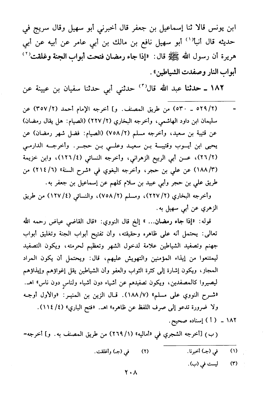 182 - حَدَّثَنَا عَبْدُ اللَّهِ قَالَ: حَدَّثَنِي أَبِي، حَدَّثَنَا سُفْيَانُ بْنُ عُيَيْنَةَ، عَنِ -[209]- الزُّهْرِيِّ، عَنْ أَبِي سَلَمَةَ، عَنْ أَبِي هُرَيْرَةَ، عَنِ النَّبِيِّ صَلَّى اللهُ عَلَيْهِ وَسَلَّمَ قَالَ: «مَنْ صَامَ رَمَضَانَ إِيمَانًا وَاحْتِسَابًا غُفِرَ لَهُ مَا تَقَدَّمَ مِنْ ذَنْبِهِ» قَالَ أَبِي: سَمِعْتُهُ مِنْ سُفْيَانَ أَرْبَعَ مَرَّاتٍ قَالَ: مَنْ صَامَ رَمَضَانَ. وَقَالَ مَرَّةً: مَنْ قَامَ رَمَضَانَ