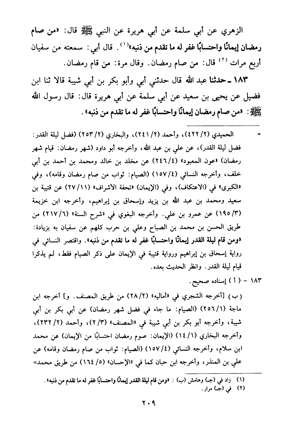 183 - حَدَّثَنَا عَبْدُ اللَّهِ قَالَ: حَدَّثَنِي أَبِي وَأَبُو بَكْرِ بْنُ أَبِي شَيْبَةَ قَالَا: ثنا ابْنُ فُضَيْلٍ، عَنْ يَحْيَى بْنِ سَعِيدٍ، عَنْ أَبِي سَلَمَةَ، عَنْ أَبِي هُرَيْرَةَ قَالَ: قَالَ رَسُولُ اللَّهِ صَلَّى اللهُ عَلَيْهِ وَسَلَّمَ: «مَنْ صَامَ رَمَضَانَ إِيمَانًا وَاحْتِسَابًا غُفِرَ لَهُ مَا تَقَدَّمَ مِنْ ذَنْبِهِ»