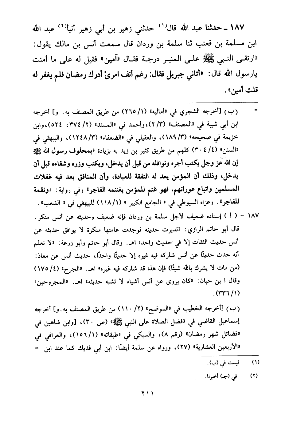 187 - حَدَّثَنَا عَبْدُ اللَّهِ قَالَ: حَدَّثَنِي زُهَيْرُ بْنُ أَبِي زُهَيْرٍ، أَنْبَأَ عَبْدُ اللَّهِ بْنُ مَسْلَمَةَ بْنِ قَعْنَبٍ، ثنا سَلَمَةُ بْنُ وَرْدَانَ قَالَ: سَمِعْتُ أَنَسَ بْنَ مَالِكٍ يَقُولُ: " ارْتَقَى النَّبِيُّ صَلَّى اللهُ عَلَيْهِ وَسَلَّمَ عَلَى الْمِنْبَرِ دَرَجَةً فَقَالَ: «آمِينَ» فَقِيلَ لَهُ: عَلَى مَا أَمَّنْتَ يَا رَسُولَ اللَّهِ؟ قَالَ: " أَتَانِي جِبْرِيلُ فَقَالَ: رَغِمَ أَنْفُ امْرِئٍ أَدْرَكَ رَمَضَانَ فَلَمْ يُغْفَرْ لَهُ، قُلْتُ: آمِينَ "