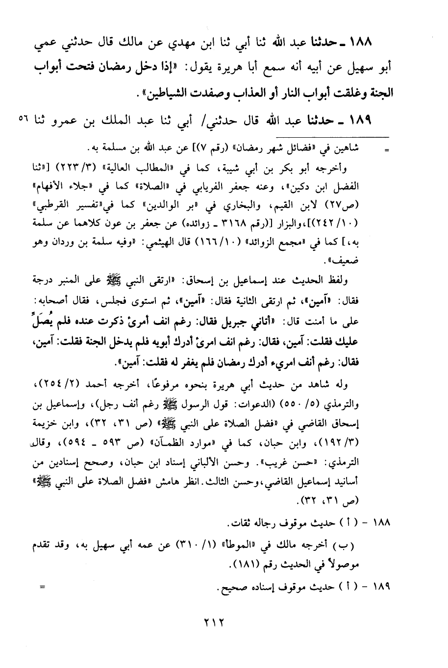 188 - حَدَّثَنَا عَبْدُ اللَّهِ، ثنا أَبِي، ثنا ابْنُ مَهْدِيٍّ، عَنْ مَالِكٍ قَالَ: حَدَّثَنِي عَمِّي أَبُو سُهَيْلٍ، عَنْ أَبِيهِ، أَنَّهُ سَمِعَ أَبَا هُرَيْرَةَ يَقُولُ: «إِذَا دَخَلَ رَمَضَانُ فُتِّحَتْ أَبْوَابُ الْجَنَّةِ، وَغُلِّقَتْ أَبْوَابُ النَّارِ أَوِ الْعَذَابِ وَصُفِّدَتِ الشَّيَاطِينُ»