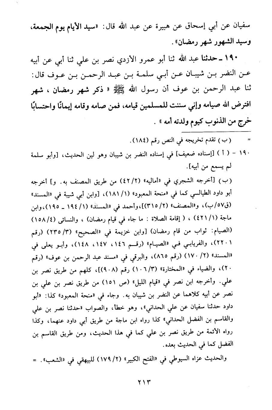 190 - حَدَّثَنَا عَبْدُ اللَّهِ، ثنا أَبُو عَمْرٍو الْأَزْدِيُّ نَصْرُ بْنُ عَلِيٍّ، ثنا أَبِي، عَنْ أَبِيهِ، عَنِ النَّضْرِ بْنِ شَيْبَانَ، عَنْ أَبِي سَلَمَةَ بْنِ عَبْدِ الرَّحْمَنِ بْنِ عَوْفٍ قَالَ: ثنا عَبْدُ الرَّحْمَنِ بْنُ عَوْفٍ، أَنَّ رَسُولَ اللَّهِ صَلَّى اللهُ عَلَيْهِ وَسَلَّمَ: «ذَكَرَ شَهْرَ رَمَضَانَ، شَهْرٌ افْتَرَضَ اللَّهُ صِيَامَهُ، وَإِنِّي سَنَنْتُ لِلْمُسْلِمِينَ قِيَامَهُ، فَمَنْ صَامَهُ وَقَامَهُ إِيمَانًا وَاحْتِسَابًا خَرَجَ مِنَ الذُّنُوبِ كَيَوْمِ وَلَدَتْهُ أُمُّهُ»