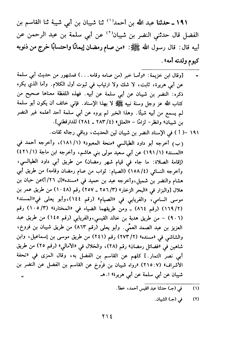 191 - حَدَّثَنَا عَبْدُ اللَّهِ بْنُ أَحْمَدَ، ثنا شَيْبَانُ بْنُ أَبِي شَيْبَةَ، ثنا الْقَاسِمُ بْنُ الْفَضْلِ قَالَ: حَدَّثَنِي النَّضْرُ بْنُ شَيْبَانَ، عَنْ أَبِي سَلَمَةَ بْنِ عَبْدِ الرَّحْمَنِ، عَنْ أَبِيهِ قَالَ: قَالَ رَسُولُ اللَّهِ صَلَّى اللهُ عَلَيْهِ وَسَلَّمَ: «مَنْ صَامَ رَمَضَانَ إِيمَانًا وَاحْتِسَابًا خَرَجَ مِنَ الذُّنُوبِ كَيَوْمِ وَلَدَتْهُ أُمُّهُ»