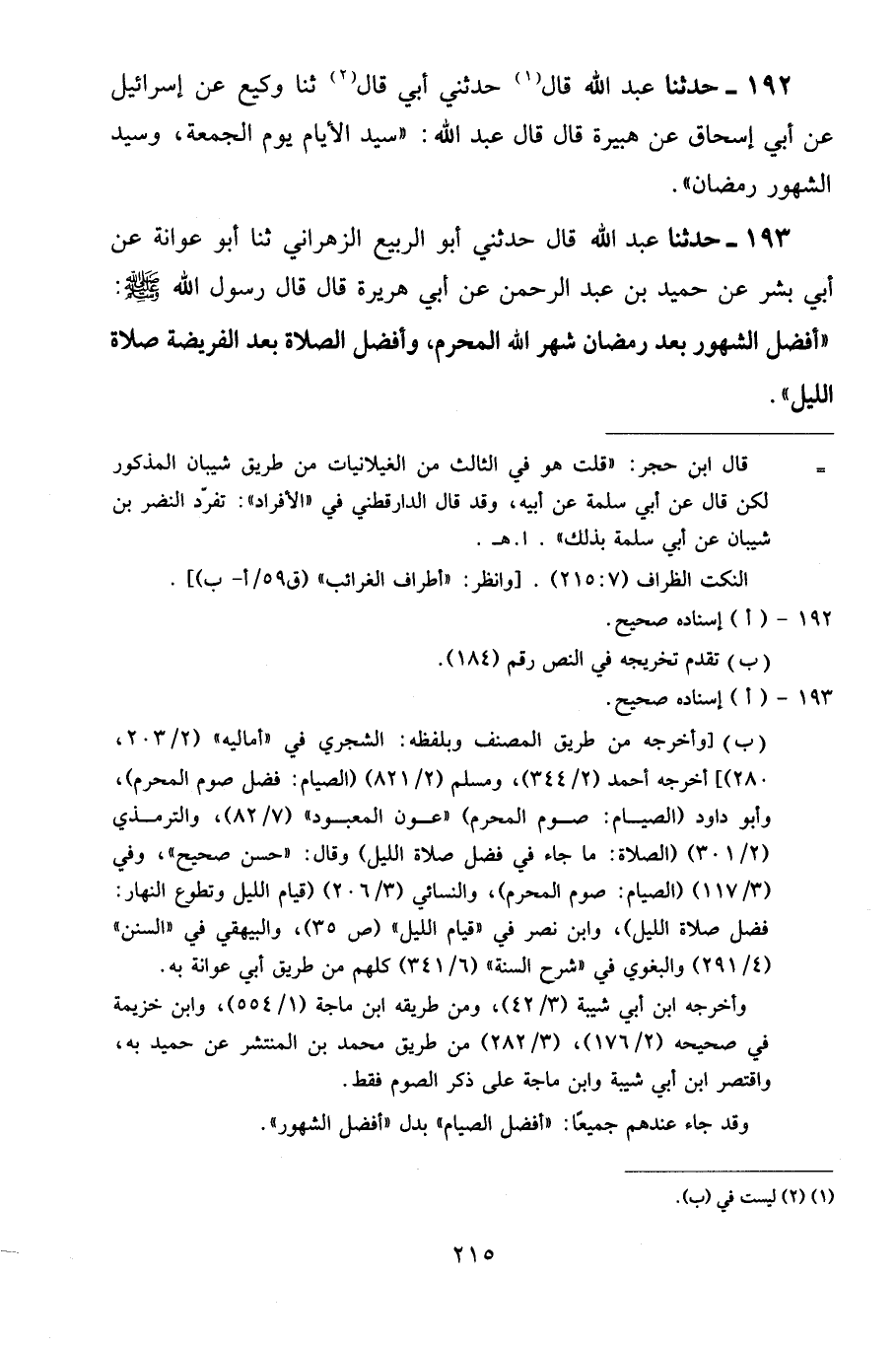 193 - حَدَّثَنَا عَبْدُ اللَّهِ قَالَ: حَدَّثَنِي أَبُو الرَّبِيعِ الزَّهْرَانِيُّ، ثنا أَبُو عَوَانَةَ، عَنْ أَبِي بِشْرٍ، عَنْ حُمَيْدِ بْنِ عَبْدِ الرَّحْمَنِ، عَنْ أَبِي هُرَيْرَةَ قَالَ: قَالَ رَسُولُ اللَّهِ صَلَّى اللهُ عَلَيْهِ وَسَلَّمَ: «أَفْضَلُ الشُّهُورِ بَعْدَ رَمَضَانَ شَهْرُ اللَّهِ الْمُحَرَّمُ، وَأَفْضَلُ الصَّلَاةِ بَعْدَ الْفَرِيضَةِ صَلَاةُ اللَّيْلِ»