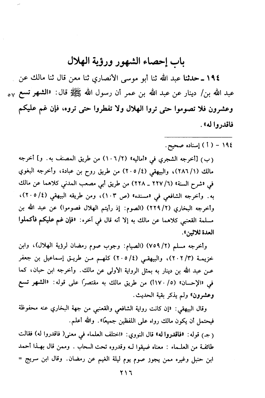 194 - حَدَّثَنَا عَبْدُ اللَّهِ، ثنا أَبُو مُوسَى الْأَنْصَارِيُّ، ثنا مَعْنٌ قَالَ: ثنا مَالِكٌ، عَنْ عَبْدِ اللَّهِ بْنِ دِينَارٍ، عَنْ عَبْدِ اللَّهِ بْنِ عُمَرَ أَنَّ رَسُولَ اللَّهِ صَلَّى اللهُ عَلَيْهِ وَسَلَّمَ قَالَ: «الشَّهْرُ تِسْعٌ وَعِشْرُونَ فَلَا تَصُومُوا حَتَّى تَرَوُا الْهِلَالَ، وَلَا تُفْطِرُوا حَتَّى تَرَوْهُ، فَإِنْ غُمَّ عَلَيْكُمْ فَاقْدُرُوا لَهُ»