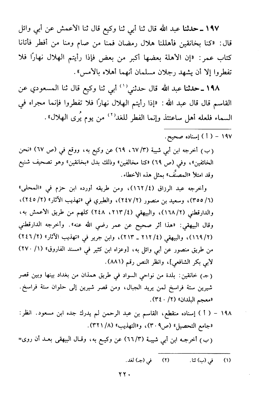 197 - حَدَّثَنَا عَبْدُ اللَّهِ قَالَ: ثنا أَبِي، ثنا وَكِيعٌ قَالَ: ثنا الْأَعْمَشُ، عَنْ أَبِي وَائِلٍ قَالَ: " كُنَّا بِخَانِقِينَ فَأَهْلَلْنَا هِلَالَ رَمَضَانَ، فَمِنَّا مَنْ صَامَ وَمِنَّا مَنْ أَفْطَرَ، فَأَتَانَا كِتَابُ عُمَرَ: «إِنَّ الْأَهِلَّةَ بَعْضُهَا أَكْبَرُ مِنْ بَعْضٍ، فَإِذَا رَأَيْتُمُ الْهِلَالَ نَهَارًا فَلَا تُفْطِرُوا إِلَّا أَنْ يَشْهَدَ رَجُلَانِ مُسْلِمَانِ أَنَّهُمَا أَهَلَّاهُ بِالْأَمْسِ»