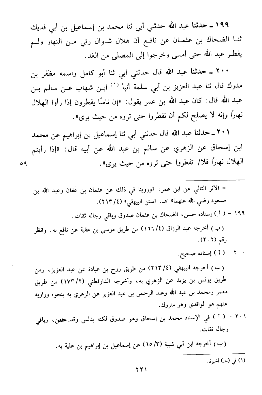 201 - حَدَّثَنَا عَبْدُ اللَّهِ قَالَ: حَدَّثَنِي أَبِي، ثنا إِسْمَاعِيلُ بْنُ إِبْرَاهِيمَ، عَنْ مُحَمَّدِ بْنِ إِسْحَاقَ، عَنِ الزُّهْرِيِّ، عَنْ سَالِمِ بْنِ عَبْدِ اللَّهِ، عَنْ أَبِيهِ قَالَ: «إِذَا رَأَيْتُمُ الْهِلَالَ نَهَارًا فَلَا تُفْطِرُوا حَتَّى تَرَوْهُ مِنْ حَيْثُ يُرَى»