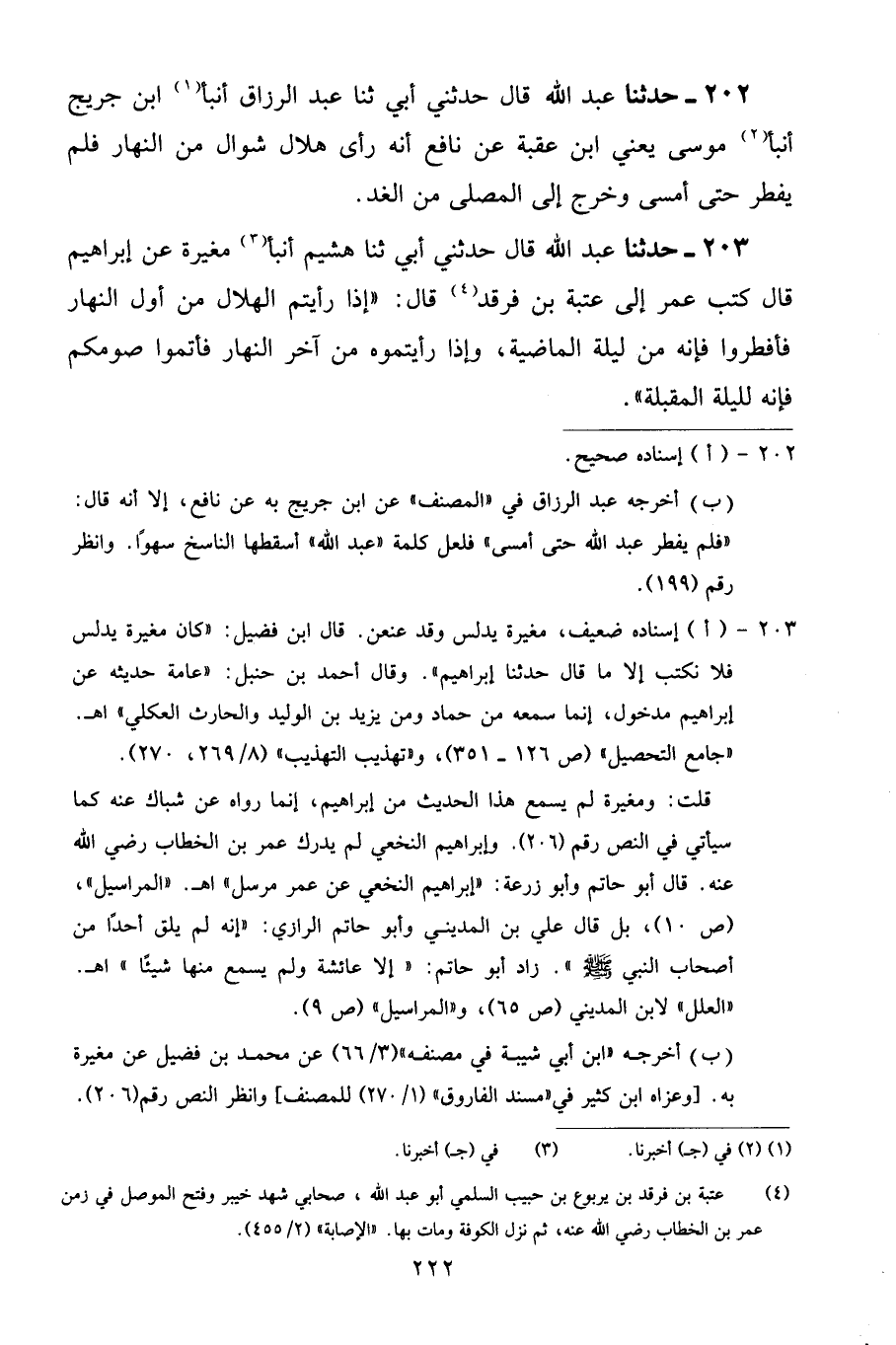 203 - حَدَّثَنَا عَبْدُ اللَّهِ قَالَ: حَدَّثَنِي أَبِي، ثنا هُشَيْمٌ، أَنْبَأَ مُغِيرَةُ، عَنْ إِبْرَاهِيمَ قَالَ: كَتَبَ عُمَرُ إِلَى عُتْبَةَ بْنِ فَرْقَدٍ قَالَ: «إِذَا رَأَيْتُمُ الْهِلَالَ مِنْ أَوَّلِ النَّهَارِ فَأَفْطِرُوا، فَإِنَّهُ مِنْ لَيْلَةِ الْمَاضِيَةِ، وَإِذَا رَأَيْتُمُوهُ مِنْ آخِرِ النَّهَارِ فَأَتِمُّوا صَوْمَكُمْ فَإِنَّهُ لِلَّيْلَةِ الْمُقْبِلَةِ»