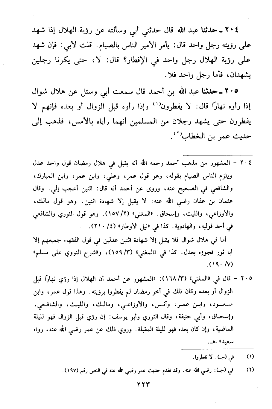 205 - حَدَّثَنَا عَبْدُ اللَّهِ بْنُ أَحْمَدَ قَالَ: سَمِعْتُ أَبِي وَسُئِلَ عَنْ هِلَالِ شَوَّالٍ إِذَا رَأَوْهُ نَهَارًا قَالَ: لَا يُفْطِرُونَ، وَإِذَا رَأَوْهُ قَبْلَ الزَّوَالِ أَوْ بَعْدَهُ فَإِنَّهُمْ لَا يُفْطِرُونَ حَتَّى يَشْهَدَ رَجُلَانِ مِنَ الْمُسْلِمِينَ أَنَّهُمَا رَأَيَاهُ بِالْأَمْسِ، فَذَهَبَ إِلَى حَدِيثِ عُمَرَ بْنِ الْخَطَّابِ