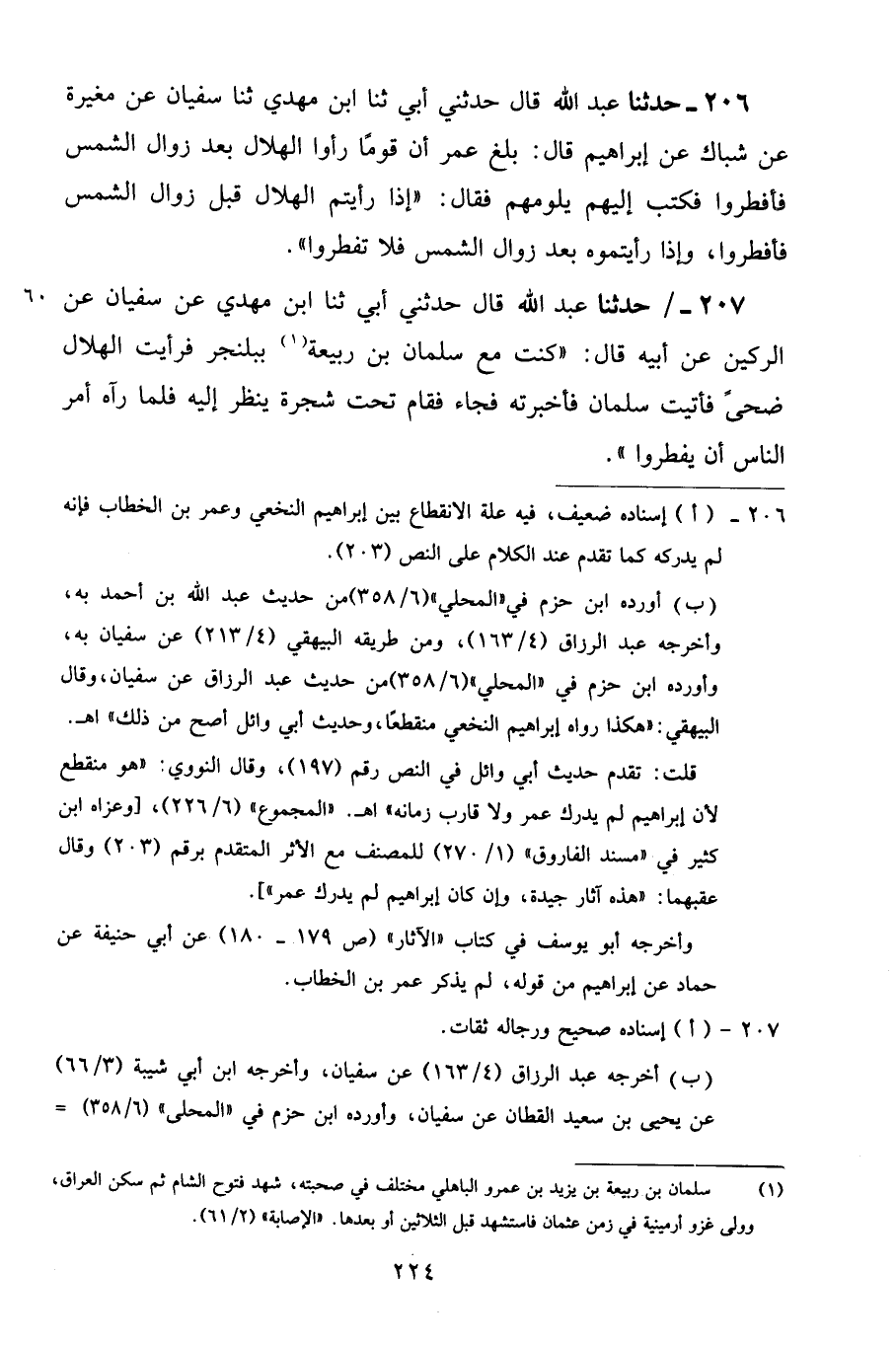 207 - حَدَّثَنَا عَبْدُ اللَّهِ قَالَ: حَدَّثَنِي أَبِي، ثنا ابْنُ مَهْدِيٍّ، عَنْ سُفْيَانَ، عَنِ الرُّكَيْنِ، عَنْ أَبِيهِ قَالَ: «كُنْتُ مَعَ سَلْمَانَ بْنِ رَبِيعَةَ بِبَلَنْجَرَ فَرَأَيْتُ الْهِلَالَ ضُحًى، فَأَتَيْتُ سَلْمَانَ فَأَخْبَرْتُهُ، فَجَاءَ فَقَامَ تَحْتَ شَجَرَةٍ يَنْظُرُ إِلَيْهِ فَلَمَّا رَآهُ أَمَرَ النَّاسَ أَنْ يُفْطِرُوا»