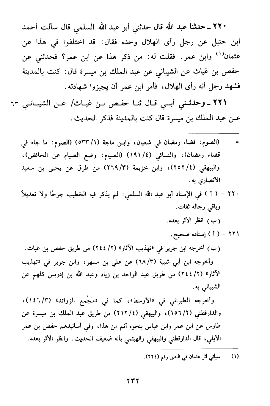 220 - حَدَّثَنَا عَبْدُ اللَّهِ قَالَ: حَدَّثَنِي أَبُو عَبْدِ اللَّهِ السُّلَمِيُّ قَالَ: سَأَلْتُ أَحْمَدَ بْنَ حَنْبَلٍ عَنْ رَجُلٍ رَأَى الْهِلَالَ وَحْدَهُ، فَقَالَ: قَدِ اخْتَلَفُوا فِي هَذَا عَنْ عُثْمَانَ وَابْنِ عُمَرَ، فَقُلْتُ لَهُ: مَنْ ذَكَرَ هَذَا عَنِ ابْنِ عُمَرَ؟ فَحَدَّثَنِي عَنْ حَفْصِ بْنِ غِيَاثٍ، عَنِ الشَّيْبَانِيِّ، عَنْ عَبْدِ الْمَلِكِ بْنِ مَيْسَرَةَ قَالَ: كُنْتُ بِالْمَدِينَةِ فَشَهِدَ رَجُلٌ أَنَّهُ رَأَى الْهِلَالَ، فَأَمَرَ ابْنُ عُمَرَ أَنْ يُجِيزُوا شَهَادَتَهُ