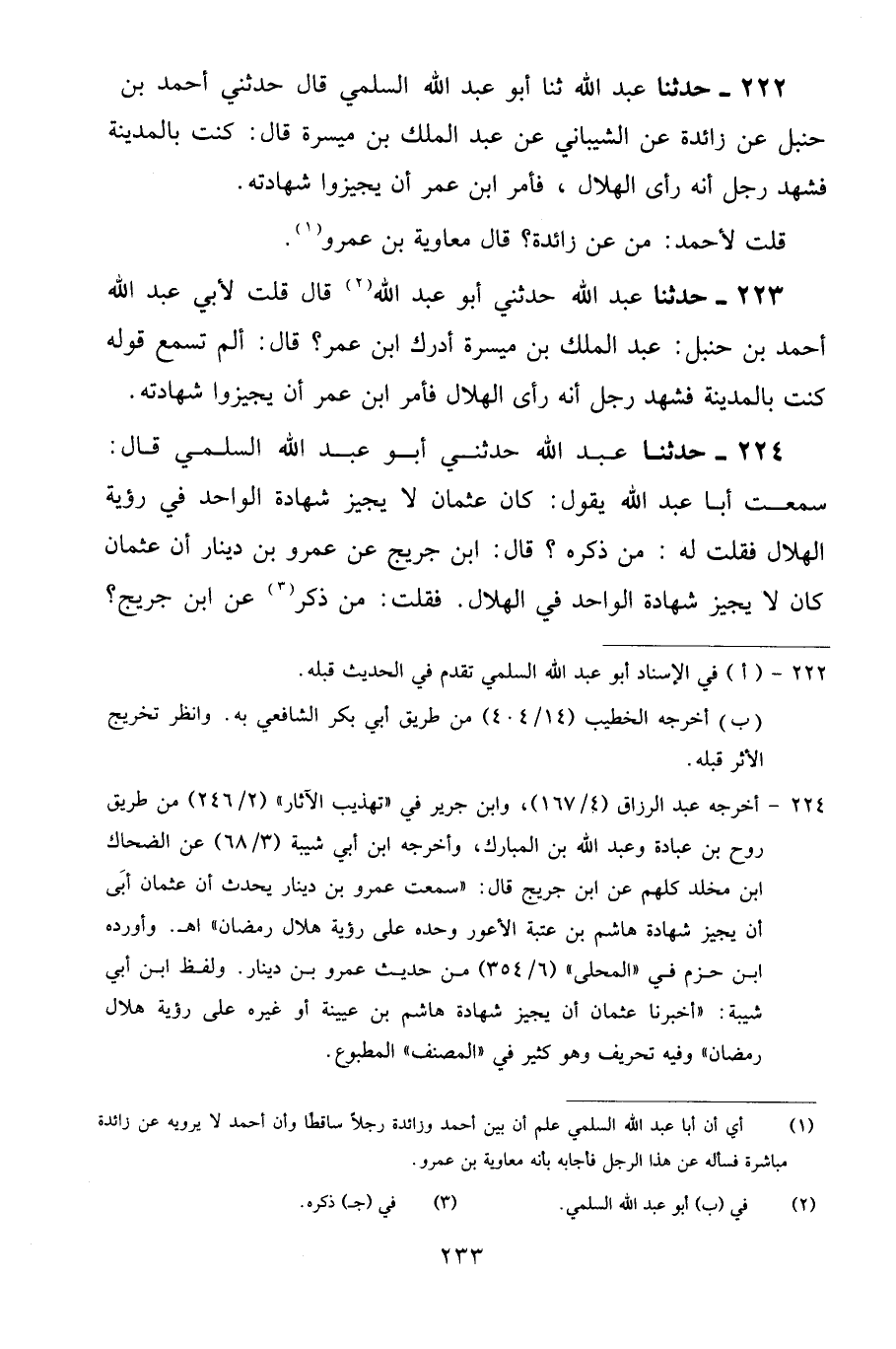 222 - حَدَّثَنَا عَبْدُ اللَّهِ، ثنا أَبُو عَبْدِ اللَّهِ السُّلَمِيُّ قَالَ: حَدَّثَنِي أَحْمَدُ بْنُ حَنْبَلٍ، عَنْ زَائِدَةَ، عَنِ الشَّيْبَانِيِّ، عَنْ عَبْدِ الْمَلِكِ بْنِ مَيْسَرَةَ قَالَ: كُنْتُ بِالْمَدِينَةِ فَشَهِدَ رَجُلٌ أَنَّهُ رَأَى الْهِلَالَ، فَأَمَرَ ابْنُ عُمَرَ أَنْ يُجِيزُوا شَهَادَتَهُ، قُلْتُ لِأَحْمَدَ: مَنْ عَنْ زَائِدَةَ؟ قَالَ: مُعَاوِيَةُ بْنُ عَمْرٍو