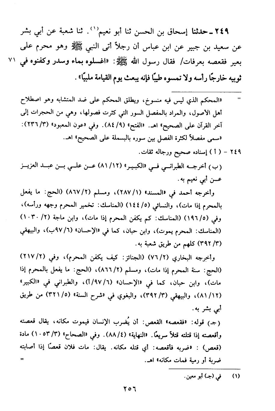249 - حَدَّثَنَا إِسْحَاقُ بْنُ الْحَسَنِ، ثنا أَبُو نُعَيْمٍ، ثنا شُعْبَةُ، عَنْ أَبِي بِشْرٍ، عَنْ سَعِيدِ بْنِ جُبَيْرٍ، عَنِ ابْنِ عَبَّاسٍ، أَنَّ رَجُلًا أَتَى النَّبِيَّ صَلَّى اللهُ عَلَيْهِ وَسَلَّمَ وَهُوَ مُحْرِمٌ عَلَى بَعِيرٍ فَقَعَصَهُ بِعَرَفَاتٍ فَقَالَ رَسُولُ اللَّهِ صَلَّى اللهُ عَلَيْهِ وَسَلَّمَ: «اغْسِلُوهُ بِمَاءٍ وَسِدْرٍ وَكَفِّنُوهُ فِي ثَوْبَيْهِ خَارِجًا رَأْسُهُ، وَلَا تُمِسُّوهُ طِيبًا فَإِنَّهُ يُبْعَثُ يَوْمَ الْقِيَامَةِ مُلَبِّيًا»