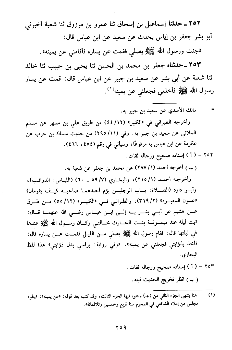 253 - حَدَّثَنَاهُ جَعْفَرُ بْنُ مُحَمَّدِ بْنِ الْحَسَنِ، ثنا يَحْيَى بْنُ حَبِيبٍ، ثنا خَالِدٌ، ثنا شُعْبَةُ، عَنْ أَبِي بِشْرٍ، عَنْ سَعِيدِ بْنِ جُبَيْرٍ، عَنِ ابْنِ عَبَّاسٍ قَالَ: «قُمْتُ عَنْ يَسَارِ رَسُولِ اللَّهِ صَلَّى اللهُ عَلَيْهِ وَسَلَّمَ فَأَخَذَنِي فَجَعَلَنِي عَنْ يَمِينِهِ»