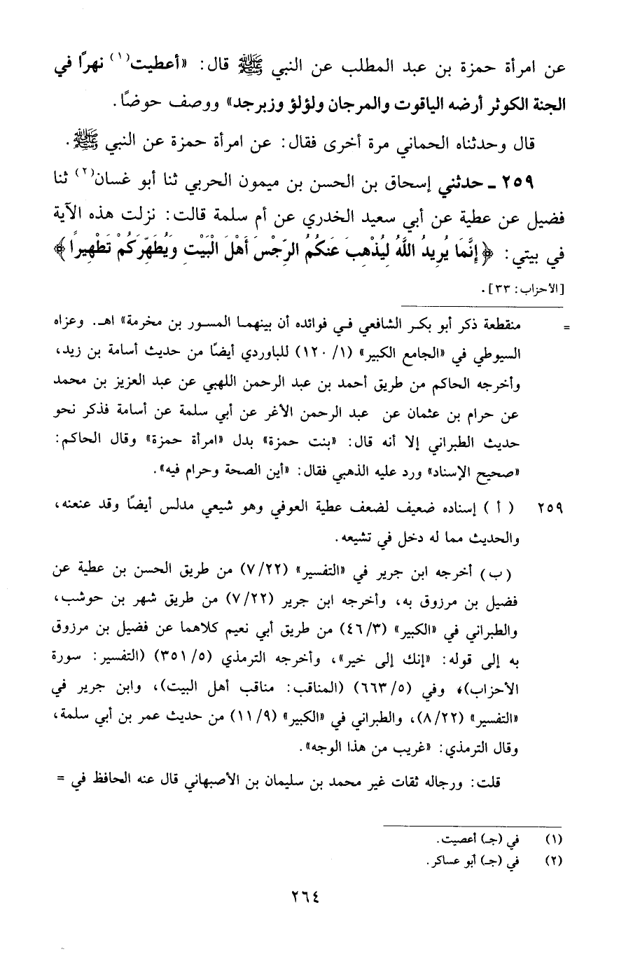 259 - حَدَّثَنِي إِسْحَاقُ بْنُ الْحَسَنِ بْنِ مَيْمُونٍ الْحَرْبِيُّ، ثنا أَبُو غَسَّانَ، ثنا فُضَيْلٌ، عَنْ عَطِيَّةَ، عَنْ أَبِي سَعِيدٍ الْخُدْرِيِّ، عَنْ أُمِّ سَلَمَةَ، قَالَتْ: نَزَلَتْ هَذِهِ الْآيَةُ فِي بَيْتِي {إِنَّمَا يُرِيدُ اللَّهُ لِيُذْهِبَ عَنْكُمُ الرِّجْسَ أَهْلَ الْبَيْتِ وَيُطَهِّرَكُمْ تَطْهِيرًا} [الأحزاب: 33]