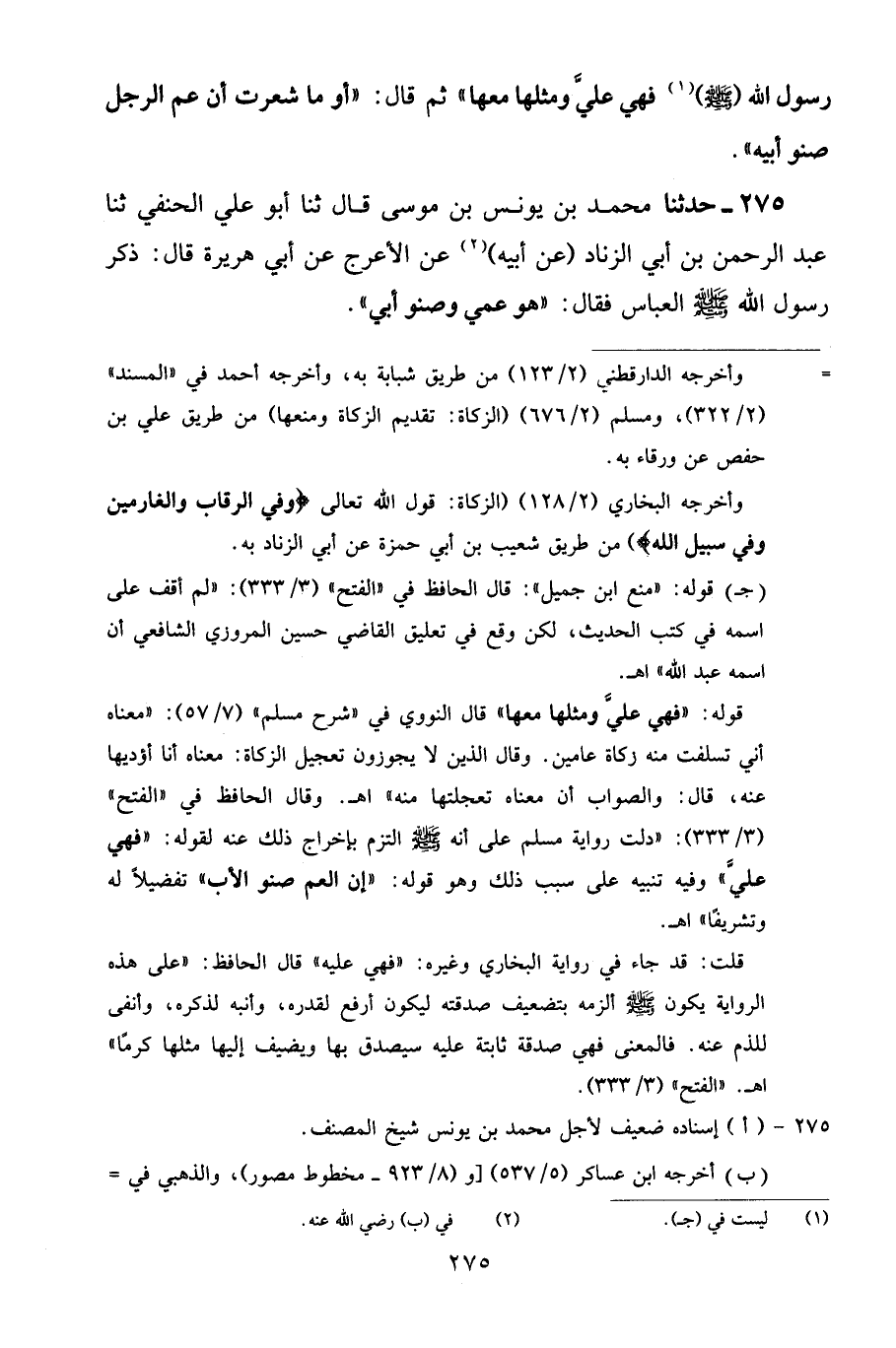 275 - حَدَّثَنَا مُحَمَّدُ بْنُ يُونُسَ بْنِ مُوسَى قَالَ: ثنا أَبُو عَلِيٍّ الْحَنَفِيُّ، ثنا عَبْدُ الرَّحْمَنِ بْنُ أَبِي الزِّنَادِ، عَنْ أَبِيهِ، عَنِ الْأَعْرَجِ، عَنْ أَبِي هُرَيْرَةَ قَالَ: ذَكَرَ رَسُولُ اللَّهِ صَلَّى اللهُ عَلَيْهِ وَسَلَّمَ الْعَبَّاسَ فَقَالَ: «هُوَ عَمِّي وَصِنْوُ أَبِي»