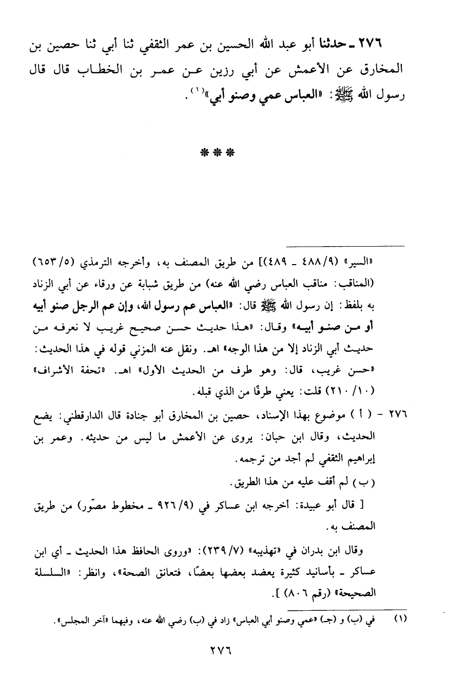 276 - حَدَّثَنَا أَبُو عَبْدِ اللَّهِ الْحُسَيْنُ بْنُ عُمَرَ الثَّقَفِيُّ، ثنا أَبِي، ثنا حُصَيْنُ بْنُ الْمُخَارِقِ، عَنِ الْأَعْمَشِ، عَنْ أَبِي رَزِينٍ، عَنْ عُمَرَ بْنِ الْخَطَّابِ قَالَ: قَالَ رَسُولُ اللَّهِ صَلَّى اللهُ عَلَيْهِ وَسَلَّمَ: «الْعَبَّاُس عَمِّي وَصِنْوُ أَبِي»
