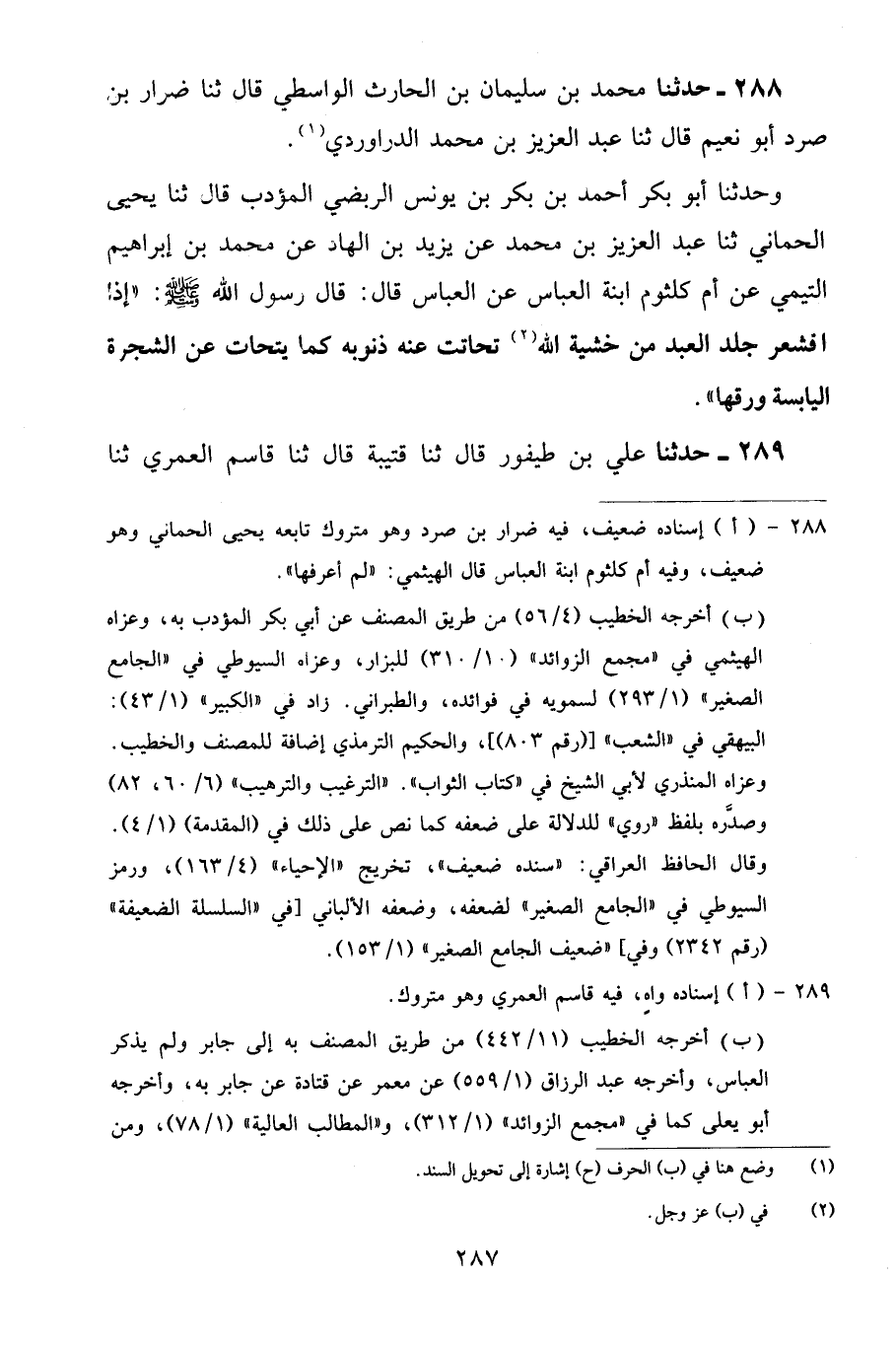 288 - حَدَّثَنَا مُحَمَّدُ بْنُ سُلَيْمَانَ بْنِ الْحَارِثِ الْوَاسِطِيُّ قَالَ: ثنا ضِرَارُ بْنُ صُرَدَ أَبُو نُعَيْمٍ قَالَ: ثنا عَبْدُ الْعَزِيزِ بْنُ مُحَمَّدٍ الدَّرَاوَرْدِيُّ، وَحَدَّثَنَا أَبُو بَكْرٍ أَحْمَدُ بْنُ بَكْرِ بْنُ يُونُسَ الرَّبَضِيُّ الْمُؤَدِّبُ قَالَ: ثنا يَحْيَى الْحِمَّانِيُّ، ثنا عَبْدُ الْعَزِيزِ بْنُ مُحَمَّدٍ، عَنْ يَزِيدَ بْنِ الْهَادِ، عَنْ مُحَمَّدِ بْنِ إِبْرَاهِيمَ التَّيْمِيِّ، عَنْ أُمِّ كُلْثُومٍ ابْنَةَ الْعَبَّاسِ، عَنِ الْعَبَّاسِ قَالَ: قَالَ رَسُولُ اللَّهِ صَلَّى اللهُ عَلَيْهِ وَسَلَّمَ: «إِذَا اقْشَعَرَّ جِلْدُ الْعَبْدِ مِنْ خَشْيَةِ اللَّهِ تَحَاتَّتْ عَنْهُ ذُنُوبُهُ كَمَا يَتَحَاتُّ عَنِ الشَّجَرَةِ الْيَابِسَةِ وَرَقُهَا»