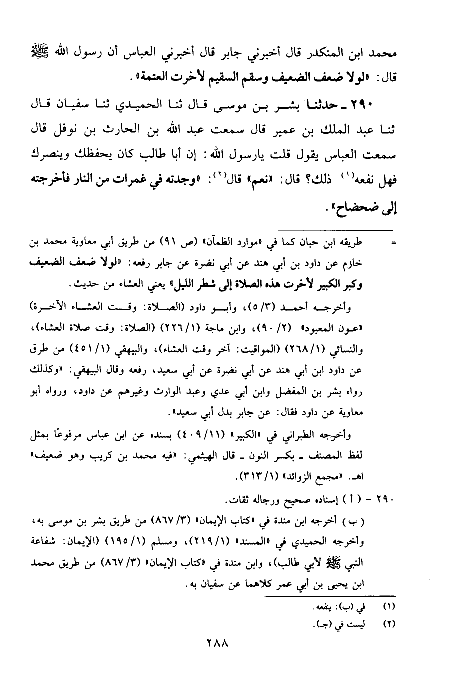 290 - حَدَّثَنَا بِشْرُ بْنُ مُوسَى قَالَ: ثنا الْحُمَيْدِيُّ، ثنا سُفْيَانُ قَالَ: ثنا عَبْدُ الْمَلِكِ بْنُ عُمَيْرٍ قَالَ: سَمِعْتُ عَبْدَ اللَّهِ بْنَ الْحَارِثِ بْنِ نَوْفَلٍ قَالَ: سَمِعْتُ الْعَبَّاسَ يَقُولُ: قُلْتُ: يَا رَسُولَ اللَّهِ إِنَّ أَبَا طَالِبٍ كَانَ يَحْفَظُكَ وَيَنْصُرُكَ فَهَلْ نَفَعَهُ ذَلِكَ؟ قَالَ: «نَعَمْ» قَالَ: «وَجَدْتُهُ فِي غَمَرَاتٍ مِنَ النَّارِ فَأَخْرَجَتْهُ إِلَى ضَحْضَاحٍ»