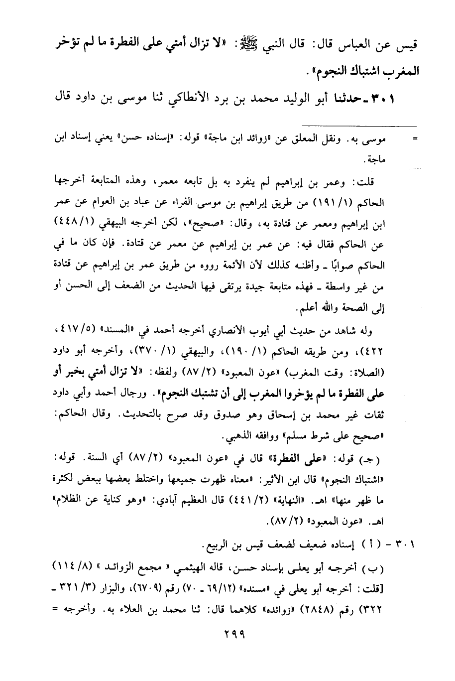 301 - حَدَّثَنَا أَبُو الْوَلِيدِ مُحَمَّدُ بْنُ بُرْدٍ الْأَنْطَاكِيُّ، ثنا مُوسَى بْنُ دَاوُدَ قَالَ -[300]-: ثنا قَيْسُ بْنُ الرَّبِيعِ، وَحَدَّثَنِي مُحَمَّدُ بْنُ بِشْرِ بْنِ مَطَرٍ قَالَ: ثنا مُحَمَّدُ بْنُ الْعَلَاءِ أَبُو كُرَيْبٍ، ثنا الْحَسَنُ بْنُ عَطِيَّةَ، ثنا قَيْسُ بْنُ الرَّبِيعِ، عَنْ يُونُسَ بْنِ عُبَيْدٍ، عَنِ الْحَسَنِ، عَنِ الْأَحْنَفِ بْنِ قَيْسٍ، عَنِ الْعَبَّاسِ بْنِ عَبْدِ الْمُطَّلِبِ قَالَ: خَرَجْتُ مَعَ النَّبِيِّ صَلَّى اللهُ عَلَيْهِ وَسَلَّمَ مِنَ الْمَدِينَةِ فَالْتَفَتَ إِلَيْهَا فَقَالَ: «إِنَّ اللَّهَ تَعَالَى قَدْ بَرَّأَ هَذِهِ الْجَزِيرَةَ مِنَ الشِّرْكِ، وَلَكِنْ أَخَافُ أَنْ تُضِلَّهُمُ النُّجُومُ» قَالَ: " يُنْزِلُ اللَّهُ تَبَارَكَ وَتَعَالَى الْغَيْثَ فَيَقُولُونَ: مُطِرْنَا بِنَوْءِ كَذَا وَكَذَا "