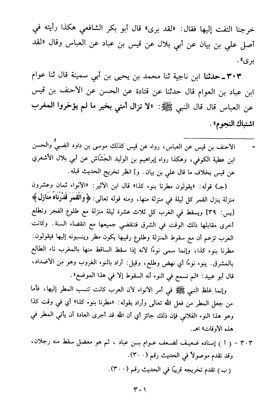 303 - حَدَّثَنَا ابْنُ نَاجِيَةَ، ثنا مُحَمَّدُ بْنُ يَحْيَى بْنِ أَبِي سَمِينَةَ قَالَ: ثنا عَوَّامُ بْنُ عَبَّادِ بْنِ الْعَوَّامِ قَالَ: حَدَّثَنَا عَنْ قَتَادَةَ، عَنِ الْحَسَنِ، عَنِ الْأَحْنَفِ بْنِ قَيْسٍ، عَنِ الْعَبَّاسِ قَالَ: قَالَ النَّبِيُّ صَلَّى اللهُ عَلَيْهِ وَسَلَّمَ: «لَا تَزَالُ أُمَّتِي بِخَيْرٍ مَا لَمْ يُؤَخِّرُوا الْمَغْرِبَ اشْتِبَاكَ النُّجُومِ»