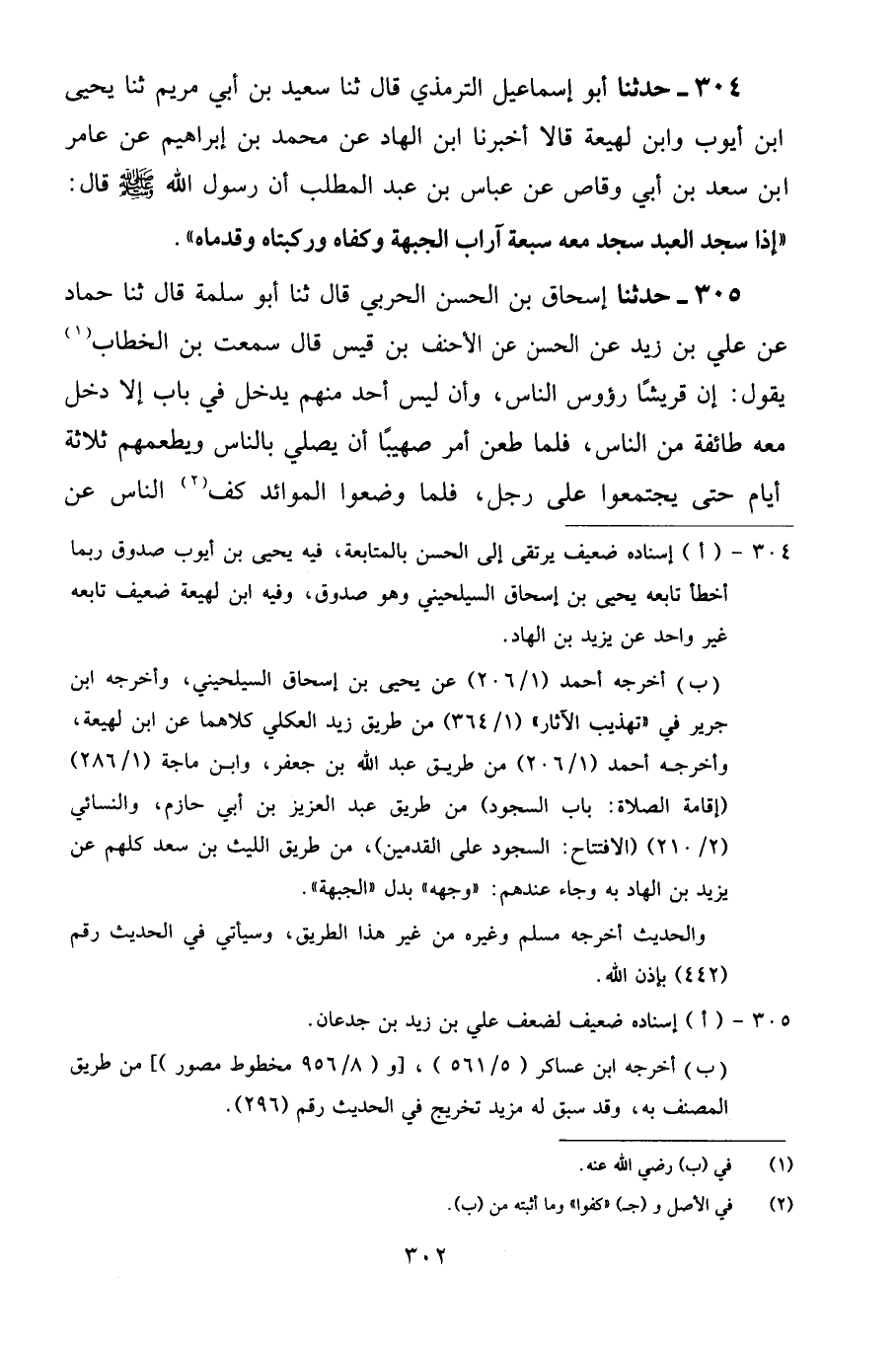 304 - حَدَّثَنَا أَبُو إِسْمَاعِيلَ التِّرْمِذِيُّ قَالَ: ثنا سَعِيدُ بْنُ أَبِي مَرْيَمَ، ثنا يَحْيَى بْنُ أَيُّوبَ، وَابْنُ لَهِيعَةَ قَالَا أَخْبَرَنَا ابْنُ الْهَادِ، عَنْ مُحَمَّدِ بْنِ إِبْرَاهِيمَ، عَنْ عَامِرِ بْنِ سَعْدِ بْنِ أَبِي وَقَّاصٍ، عَنْ عَبَّاسِ بْنِ عَبْدِ الْمُطَّلِبِ أَنَّ رَسُولَ اللَّهِ صَلَّى اللهُ عَلَيْهِ وَسَلَّمَ قَالَ: " إِذَا سَجَدَ الْعَبْدُ سَجَدَ مَعَهُ سَبْعَةُ آرَابٍ: الْجَبْهَةُ وَكَفَّاهُ وَرُكْبَتَاهُ وَقَدَمَاهُ "