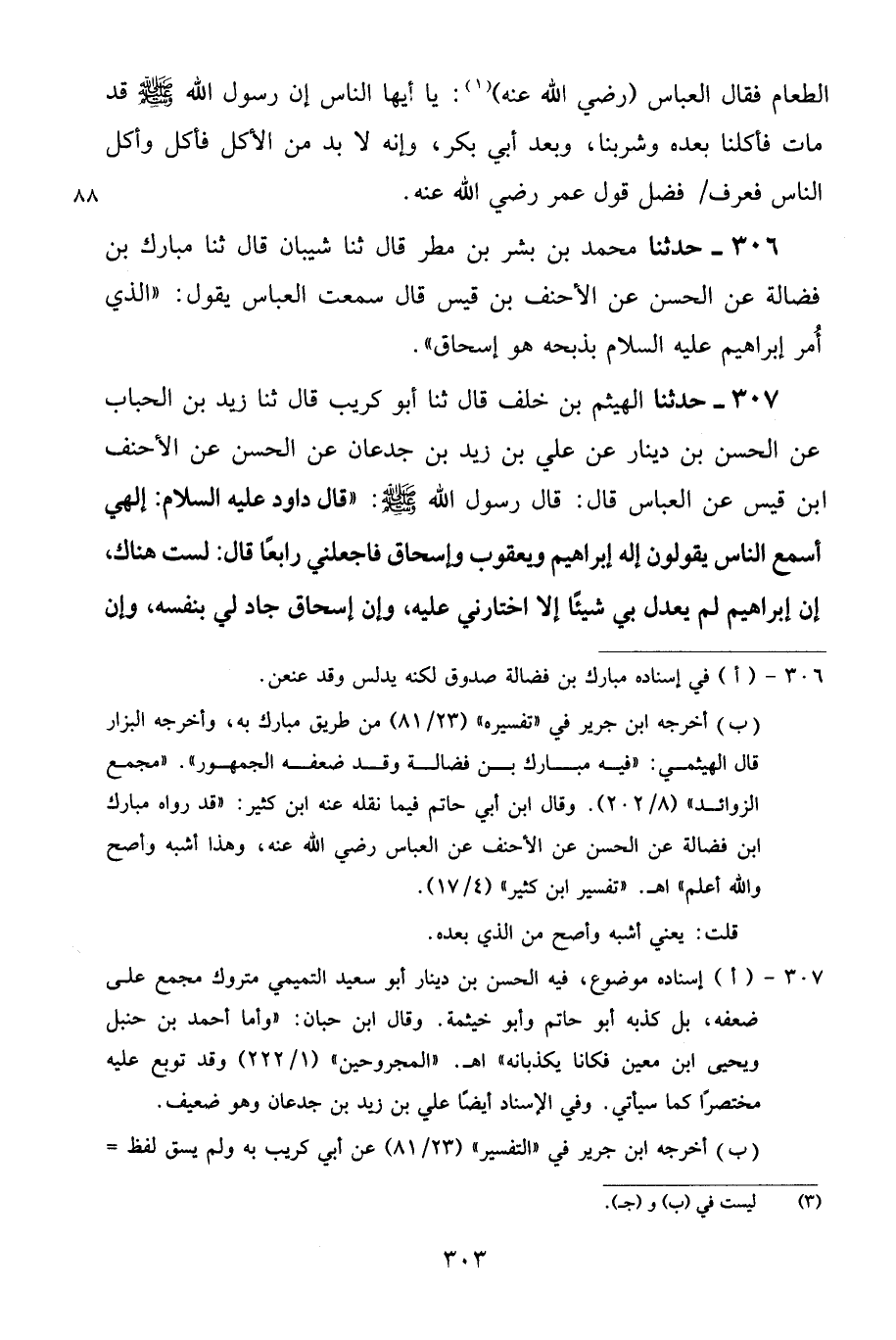306 - حَدَّثَنَا مُحَمَّدُ بْنُ بِشْرِ بْنِ مَطَرٍ قَالَ: ثنا شَيْبَانُ قَالَ: ثنا مُبَارَكُ بْنُ فَضَالَةَ، عَنِ الْحَسَنِ، عَنِ الْأَحْنَفِ بْنِ قَيْسٍ قَالَ: سَمِعْتُ الْعَبَّاسَ يَقُولُ: «الَّذِي أُمِرَ إِبْرَاهِيمُ عَلَيْهِ السَّلَامُ بِذَبْحِهِ هُوَ إِسْحَاقُ»