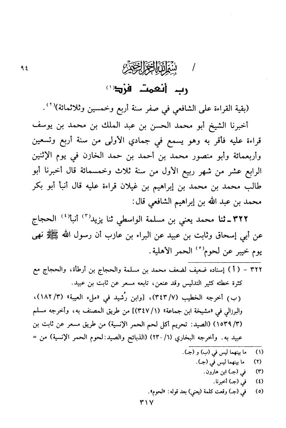 بَقِيَّةُ الْقِرَاءَةِ عَلَى الشَّافِعِيِّ فِي صَفَرٍ سَنَةَ أَرْبَعٍ وَخَمْسِينَ وَثَلَاثِمِائَةٍ. أَخْبَرَنَا الشَّيْخُ أَبُو مُحَمَّدٍ الْحَسَنُ بْنُ عَبْدِ الْمَلِكِ بْنِ مُحَمَّدِ بْنِ يُوسُفَ قِرَاءَةً عَلَيْهِ فَأَقَرَّ بِهِ وَهُوَ يَسْمَعُ فِي جُمَادَى الْأُولَى مِنْ سَنَةِ أَرْبَعٍ وَتِسْعِينَ وَأَرْبَعِمِائَةٍ، وَأَبُو مَنْصُورٍ مُحَمَّدُ بْنُ أَحْمَدَ بْنِ حَمَدٍ الْخَازِنِ فِي يَوْمِ الْإِثْنِينِ الرَّابِعِ عَشَرَ مِنْ شَهْرِ رَبِيعٍ الْأَوَّلِ مِنْ سَنَةِ ثَلَاثٍ وَخَمْسِمِائَةٍ قَالَ: أَخْبَرَنَا أَبُو طَالِبٍ مُحَمَّدُ بْنُ مُحَمَّدِ بْنِ إِبْرَاهِيمَ بْنِ غَيْلَانَ قِرَاءَةً عَلَيْهِ قَالَ: أَنْبَأَ أَبُو بَكْرٍ مُحَمَّدُ بْنُ عَبْدِ اللَّهِ بْنِ إِبْرَاهِيمَ الشَّافِعِيُّ قَالَ: