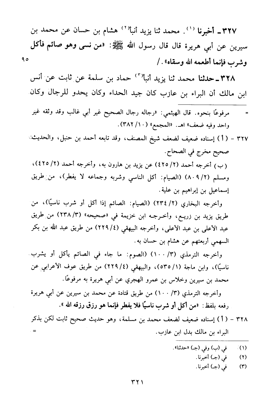 327 - أَخْبَرَنَا مُحَمَّدٌ، ثنا يَزِيدُ، أَنْبَأَ هِشَامُ بْنُ حَسَّانَ، عَنْ مُحَمَّدِ بْنِ سِيرِينَ، عَنْ أَبِي هُرَيْرَةَ قَالَ: قَالَ رَسُولُ اللَّهِ صَلَّى اللهُ عَلَيْهِ وَسَلَّمَ: «مَنْ نَسَى وَهُوَ صَائِمٌ فَأَكَلَ وَشَرِبَ فَإِنَّمَا أَطْعَمَهُ اللَّهُ وَسَقَاهُ»