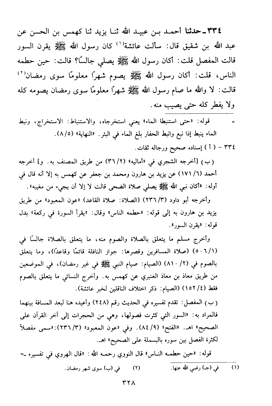 334 - حَدَّثَنَا أَحْمَدُ بْنُ عُبَيْدِ اللَّهِ، ثنا يَزِيدُ، ثنا كَهْمَسُ بْنُ الْحَسَنِ، عَنْ عَبْدِ اللَّهِ بْنِ شَقِيقٍ قَالَ: سَأَلْتُ عَائِشَةَ أَكَانَ رَسُولُ اللَّهِ صَلَّى اللهُ عَلَيْهِ وَسَلَّمَ يَقْرُنُ السُّوَرَ؟ قَالَتِ: الْمُفَصَّلُ، قُلْتُ: أَكَانَ رَسُولُ اللَّهِ صَلَّى اللهُ عَلَيْهِ وَسَلَّمَ يُصَلِّي جَالِسًا؟ قَالَتْ: حِينَ حَطَمَهُ النَّاسُ، قُلْتُ: أَكَانَ رَسُولُ اللَّهِ صَلَّى اللهُ عَلَيْهِ وَسَلَّمَ يَصُومُ شَهْرًا مَعْلُومًا سِوَى رَمَضَانَ؟ قَالَتْ: لَا وَاللَّهِ مَا صَامَ رَسُولُ اللَّهِ صَلَّى اللهُ عَلَيْهِ وَسَلَّمَ شَهْرًا مَعْلُومًا سِوَى رَمَضَانَ يَصُومُهُ كُلَّهُ وَلَا يُفْطِرُ كُلَّهُ حَتَّى يُصِيبَ مِنْهُ