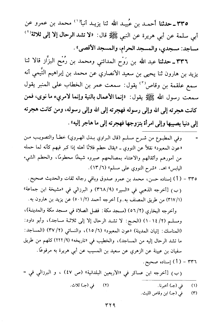 335 - حَدَّثَنَا أَحْمَدُ بْنُ عُبَيْدِ اللَّهِ، ثنا يَزِيدُ، أَنْبَأَ مُحَمَّدُ بْنُ عَمْرٍو، عَنْ أَبِي سَلَمَةَ، عَنْ أَبِي هُرَيْرَةَ، عَنِ النَّبِيِّ صَلَّى اللهُ عَلَيْهِ وَسَلَّمَ قَالَ: " لَا تُشَدُّ الرِّحَالُ إِلَّا إِلَى ثَلَاثَةِ مَسَاجِدَ: مَسْجِدِي، وَالْمَسْجِدُ الْحَرَامُ، وَالْمَسْجِدُ الْأَقْصَى "
