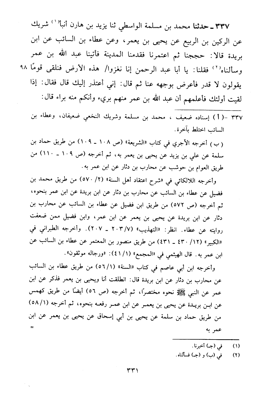 337 - حَدَّثَنَا مُحَمَّدُ بْنُ مَسْلَمَةَ الْوَاسِطِيُّ ثنا يَزِيدُ بْنُ هَارُونَ، أَنْبَأَ شَرِيكٌ، عَنِ الرُّكَيْنِ بْنِ الرَّبِيعِ، عَنْ يَحْيَى بْنِ يَعْمَرَ، وَعَنْ عَطَاءِ بْنِ السَّائِبِ، عَنِ ابْنِ بُرَيْدَةَ قَالَا: حَجَجْنَا ثُمَّ اعْتَمَرْنَا فَقَدِمْنَا الْمَدِينَةَ فَأَتَيْنَا عَبْدَ اللَّهِ بْنَ عُمَرَ وَسَأَلْنَاهُ فَقُلْنَا: يَا أَبَا عَبْدِ الرَّحْمَنِ إِنَّا نَغْزُو هَذِهِ الْأَرْضَ فَنَلْقَى قَوْمًا يَقُولُونَ: لَا قَدَرَ فَأَعْرَضَ بِوَجْهِهِ عَنَّا ثُمَّ قَالَ: إِنِّي أَعْتَذِرُ إِلَيْكَ قَالَ: فَقَالَ: إِذَا لَقِيتَ أُولَئِكَ فَأَعْلِمْهُمْ أَنَّ عَبْدَ اللَّهِ بْنَ عُمَرَ مِنْهُمْ بَرِيءٌ وَأَنَّكُمْ مِنْهُ بَرَاءٌ. قَالَ -[332]-: بَيْنَا نَحْنُ عِنْدَ رَسُولِ اللَّهِ صَلَّى اللهُ عَلَيْهِ وَسَلَّمَ إِذْ أَتَاهُ رَجُلٌ حَسَنُ الْوَجْهِ حَسَنُ الشَّارَةِ طَيِّبُ الرِّيحِ فَعَجِبْنَا مِنْ حُسْنِ وَجْهِهِ وَشَارَتِهِ وَطِيبِ رِيحِهِ، قَالَ: فَسَلَّمَ عَلَى النَّبِيِّ صَلَّى اللهُ عَلَيْهِ وَسَلَّمَ ثُمَّ قَامَ فَقَالَ: أَدْنُو يَا رَسُولَ اللَّهِ؟ قَالَ: «نَعَمْ» قَالَ: فَدَنَا، ثُمَّ قَامَ فَتَعَجَّبْنَا مِنْ تَوْقِيرِهِ رَسُولَ اللَّهِ قَالَ: نَعَمْ، قَالَ: فَدَنَا حَتَّى وَضَعَ فَخِذَهُ عَلَى فَخِذِ رَسُولِ اللَّهِ صَلَّى اللهُ عَلَيْهِ وَسَلَّمَ أَوْ رِجْلَهُ عَلَى رِجْلِ رَسُولِ اللَّهِ صَلَّى اللهُ عَلَيْهِ وَسَلَّمَ، ثُمَّ قَالَ: يَا رَسُولَ اللَّهِ مَا الْإِيمَانُ؟ قَالَ: «أَنْ تُؤْمِنَ بِاللَّهِ وَمَلَائِكَتِةِ وَكُتُبِهِ وَرُسُلِهِ وَالْيَوْمِ الْآخِرِ وَالْبَعْثِ بَعْدَ الْمَوْتِ وَالْحِسَابِ وَالْقَدَرِ كُلِّهِ خَيْرِهِ وَشَرِّهِ وَحُلْوِهِ وَمُرِّهِ» قَالَ: صَدَقْتَ، فَتَعَجَّبْنَا مِنْ قَوْلِهِ لِرَسُولِ اللَّهِ صَلَّى اللهُ عَلَيْهِ وَسَلَّمَ: صَدَقْتَ. قَالَ: ثُمَّ قَالَ: يَا رَسُولَ اللَّهِ: مَا الْإِسْلَامُ؟ قَالَ: «تَشْهَدُ أَنْ لَا إِلَهَ إِلَّا اللَّهُ وَأَنِّي رَسُولُ اللَّهِ، وَتُقِيمُ الصَّلَاةَ، وَتُؤْتِي الزَّكَاةَ، وَتَصُومُ رَمَضَانَ، وَتَحُجُّ الْبَيْتَ، وَتَغْتَسِلُ مِنَ الْجَنَابَةِ». قَالَ: صَدَقْتَ قَالَ: فَعَجِبْنَا لِتَصْدِيقِهِ رَسُولَ اللَّهِ صَلَّى اللهُ عَلَيْهِ وَسَلَّمَ، ثُمَّ قَالَ: يَا رَسُولَ اللَّهِ مَا الْإِحْسَانُ؟ قَالَ: «أَنْ تَخْشَى اللَّهَ كَأَنَّكَ تَرَاهُ فَإِنْ لَمْ تَكُنْ تَرَاهُ فَإِنَّهُ يَرَاكَ» قَالَ: صَدَقْتَ، فَعَجِبْنَا لِتَصْدِيقِهِ رَسُولَ اللَّهِ، قَالَ: ثُمَّ قَالَ: يَا رَسُولَ اللَّهِ فَمَتَى السَّاعَةُ؟ قَالَ: «مَا الْمَسْئُولُ عَنْهَا بِأَعْلَمَ بِهَا مِنَ السَّائِلِ». قَالَ: صَدَقْتَ، فَتَعَجَّبْنَا مِنْ -[333]- تَصْدِيقِهِ لِرَسُولِ اللَّهِ صَلَّى اللهُ عَلَيْهِ وَسَلَّمَ. قَالَ: ثُمَّ انْكَفَأَ رَاجِعًا فَقَالَ رَسُولُ اللَّهِ صَلَّى اللهُ عَلَيْهِ وَسَلَّمَ: «عَلَيَّ الرَّجُلَ» قَالَ: فَطَلَبْنَاهُ فَلَمْ نَجِدْهُ، قَالَ: فَقُلْنَا: لَمْ نَجِدْهُ، قَالَ: فَقَالَ رَسُولُ اللَّهِ صَلَّى اللهُ عَلَيْهِ وَسَلَّمَ: «هَذَا جِبْرِيلُ جَاءَكُمْ يُعَلِّمُكُمْ أَمْرَ دِينِكُمْ، وَمَا أَتَانِي فِي صُورَةٍ إِلَّا عَرَفْتُهُ إِلَّا فِي صُورَتِهِ هَذِهِ»