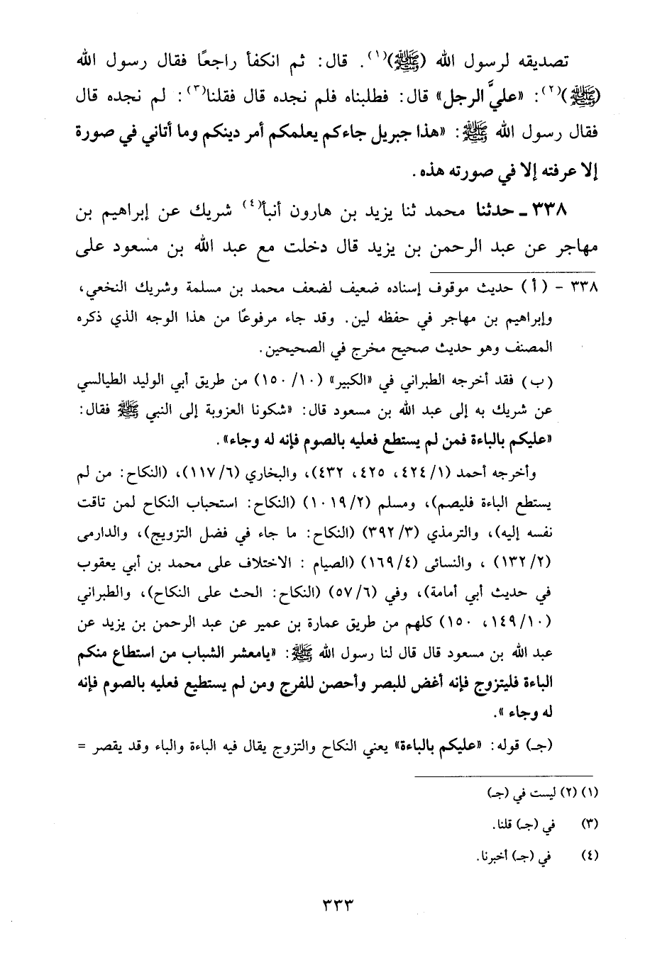338 - حَدَّثَنَا مُحَمَّدٌ، ثنا يَزِيدُ بْنُ هَارُونَ، أَنْبَأَ شَرِيكٌ، عَنْ إِبْرَاهِيمَ بْنِ مُهَاجِرٍ، عَنْ عَبْدِ الرَّحْمَنِ بْنِ يَزِيدَ قَالَ دَخَلْتُ مَعَ عَبْدِ اللَّهِ بْنِ مَسْعُودٍ عَلَى -[334]- عُثْمَانَ وَأَنَا شَابٌّ فَقَالَ: «يَا مَعْشَرَ الشَّبَابِ مَنِ اسْتَطَاعَ مِنْكُمْ أَنْ يَتَزَوَّجَ فَلْيَتَزَوَّجْ، وَإِلَّا فَلْيَصُمْ فَإِنَّ الصَّوْمَ لَهُ وِجَاءٌ»