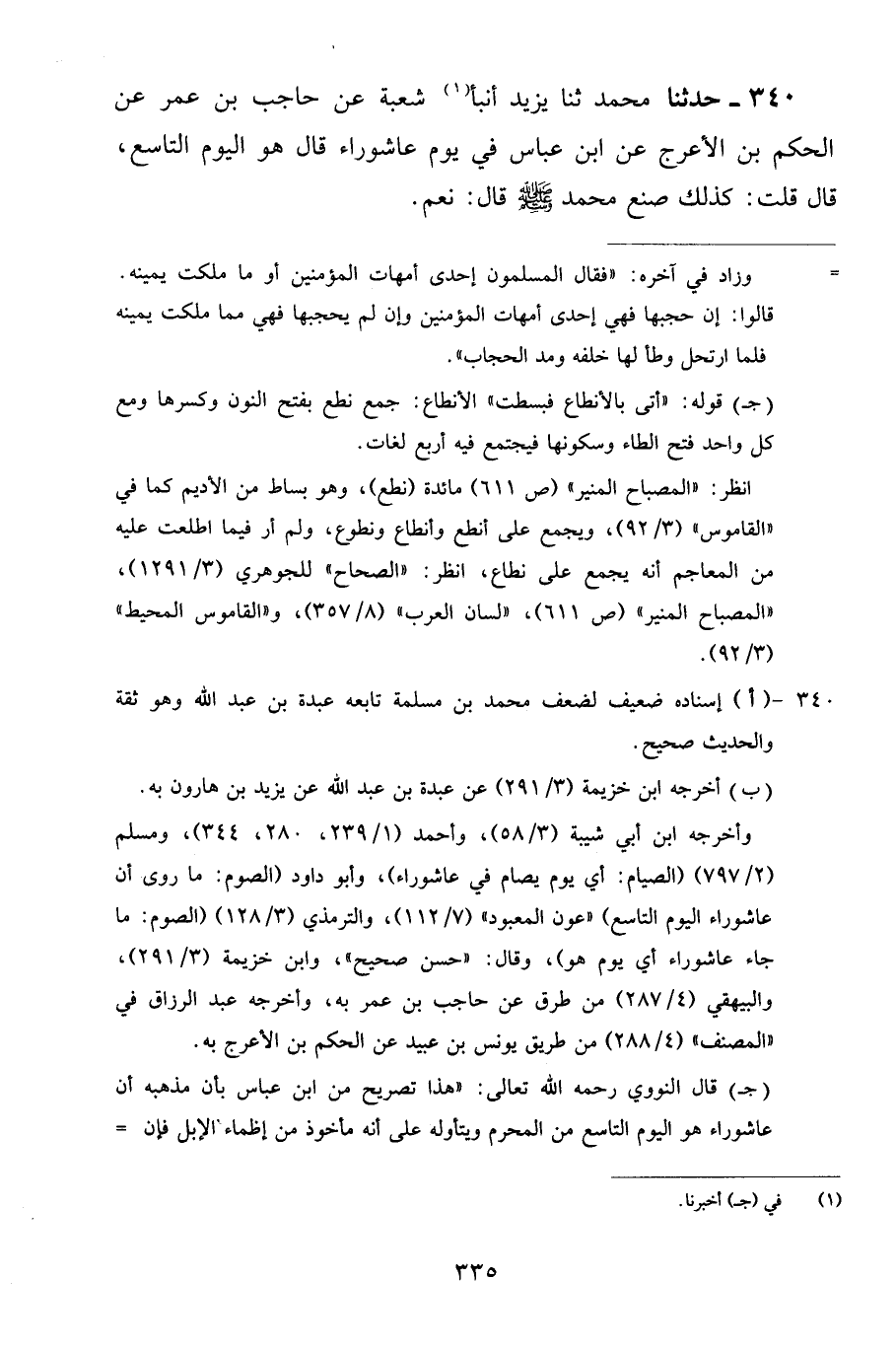 340 - حَدَّثَنَا مُحَمَّدٌ، ثنا يَزِيدُ، أَنْبَأَ شُعْبَةُ، عَنْ حَاجِبِ بْنِ عُمَرَ، عَنِ الْحَكَمِ بْنِ الْأَعْرَجِ، عَنِ ابْنِ عَبَّاسٍ فِي يَوْمِ عَاشُورَاءَ قَالَ: هُوَ الْيَوْمُ التَّاسِعُ قَالَ: قُلْتُ: كَذَلِكَ صَنَعَ مُحَمَّدٌ صَلَّى اللهُ عَلَيْهِ وَسَلَّمَ؟ قَالَ: نَعَمْ