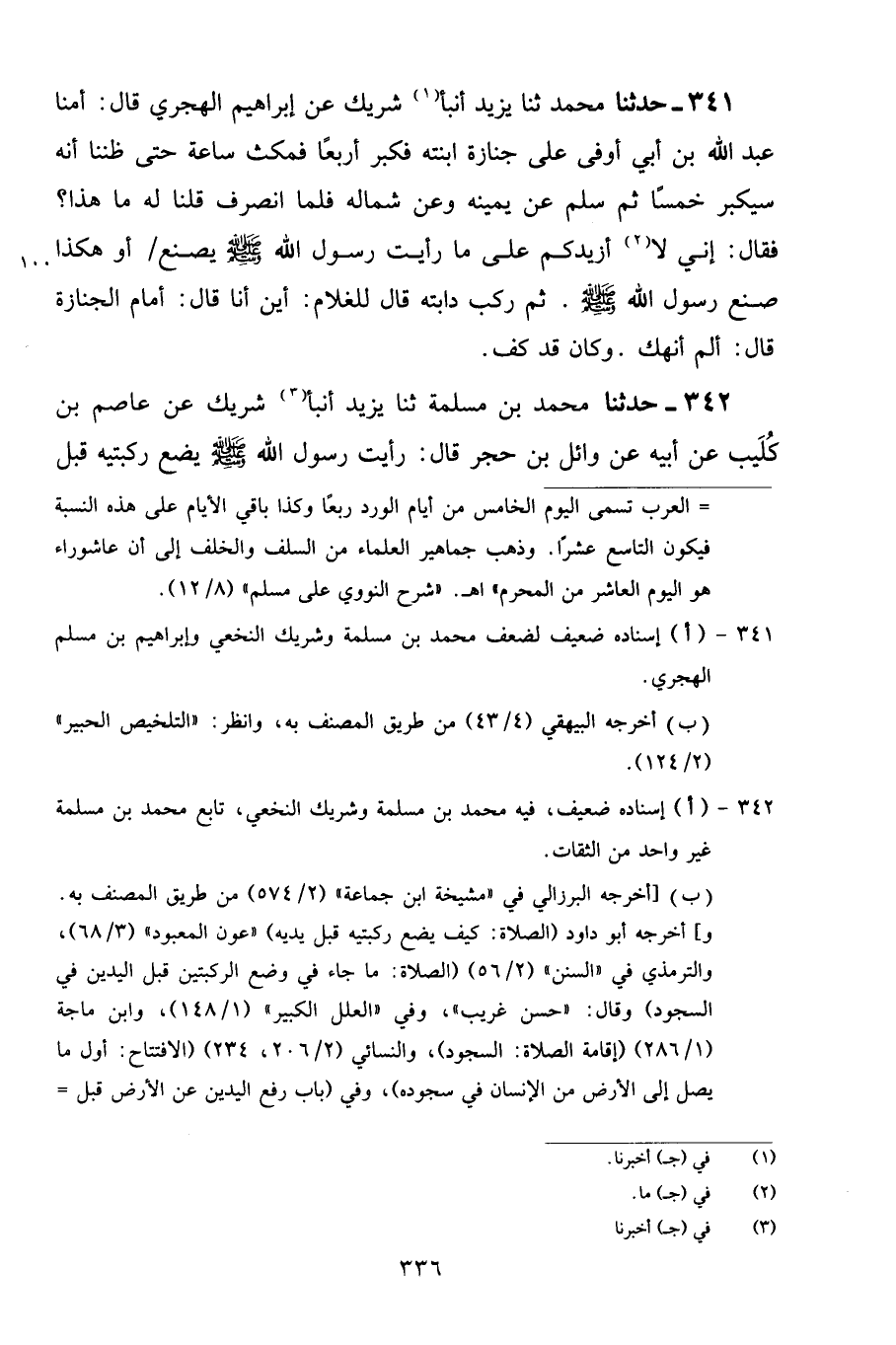 342 - حَدَّثَنَا مُحَمَّدُ بْنُ مَسْلَمَةَ، ثنا يَزِيدُ، أَنْبَأَ شَرِيكٌ، عَنْ عَاصِمِ بْنِ كُلَيْبٍ، عَنْ أَبِيهِ، عَنْ وَائِلِ بْنِ حُجْرٍ قَالَ: «رَأَيْتُ رَسُولَ اللَّهِ صَلَّى اللهُ عَلَيْهِ وَسَلَّمَ يَضَعُ رُكْبَتَيْهِ قَبْلَ -[337]- يَدَيْهِ، وَيَرْفَعُ يَدَيْهِ قَبْلَ رُكْبَتَيْهِ»